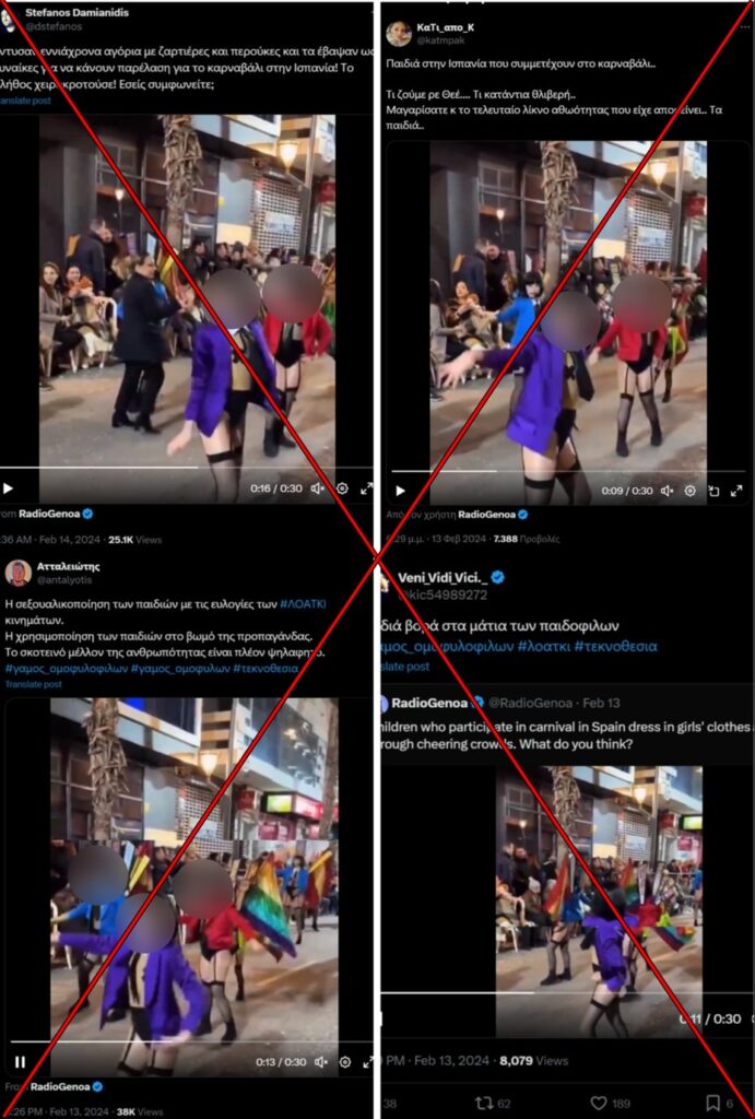 Όσον αφορά το βίντεο, πράγματι προέρχεται από το καρναβάλι Torrevieja (το πρόγραμμα εδώ) που έλαβε χώρα στο Αλικάντε της Ισπανίας και τραβήχτηκε στις 12 Φεβρουαρίου 2024 (η παρέλαση ήταν να λάβει χώρα στις 10/2 αλλά αναβλήθηκε λόγω καιρού). Κατόπιν, το βίντεο χρησιμοποιήθηκε από το ακροδεξιό κόμμα VOX, αλλά και εκατοντάδες λογαριασμούς στα ΜΚΔ, περιγράφοντας την εμφάνιση ως απόπειρα εκμετάλλευσης των παιδιών, ακόμη και σεξουαλικής, από την LGBT κοινότητα.