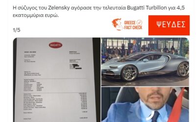 ΙΣΧΥΡΙΣΜΟΣ: Η Όλενα Ζελένσκα αγόρασε την τελευταία Bugatti Turbillon για 4,5 εκατομμύρια ευρώ. ΣΥΜΠΕΡΑΣΜΑ: Ο ισχυρισμός είναι ψευδής διότι το τιμολόγιο/δελτίο παραγγελίας δεν είναι έγκυρο. Ξεκίνησε από γαλλόφωνη σελίδα που δημιουργήθηκε μόλις πριν 10 ημέρες. Η Bugatti Paris διέψευσε τον ισχυρισμό. Ο ισχυρισμός κυκλοφόρησε στο X (πρώην Twitter) από τον λογαριασμό “laralara_Z” που παραπληροφορεί συστηματικά … Συνεχίστε να διαβάζετε το Ρωσική προπαγάνδα: Η σύζυγος του Ζελένσκι ΔΕΝ αγόρασε μια Bugatti Turbillon για 4,5 εκατομμύρια ευρώ.
