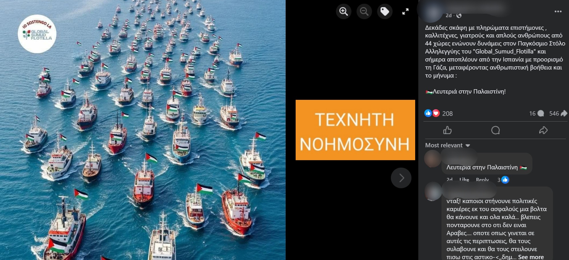 Τέλη Αυγούστου, μια εικόνα άρχισε να κυκλοφορεί στο Facebook και στο X στα ελληνικά, δείχνοντας έναν μεγάλο στολίσκο σκαφών να φέρουν την παλαιστινιακή σημαία, με τον ισχυρισμό ότι επρόκειτο για τη Global Sumud Flotilla, που αναχώρησε από τη Βαρκελώνη προς τη Λωρίδα της Γάζας. Στις αναρτήσεις δεν γίνεται καμία αναφορά ότι η εικόνα έχει δημιουργηθεί με τεχνητή νοημοσύνη (ΤΝ), ενώ τα σχόλια των χρηστών δείχνουν ότι οι άνθρωποι πιστεύουν πως πρόκειται για πραγματική εικόνα του στολίσκου. Επιπλέον, διαδικτυακά άρθρα, όπως εδώ και εδώ, κοινοποίησαν επίσης την εικόνα χωρίς να αναφέρουν ότι πρόκειται για δημιουργία ΤΝ.