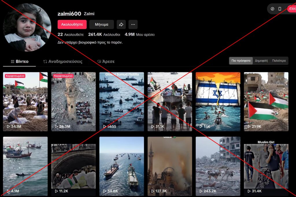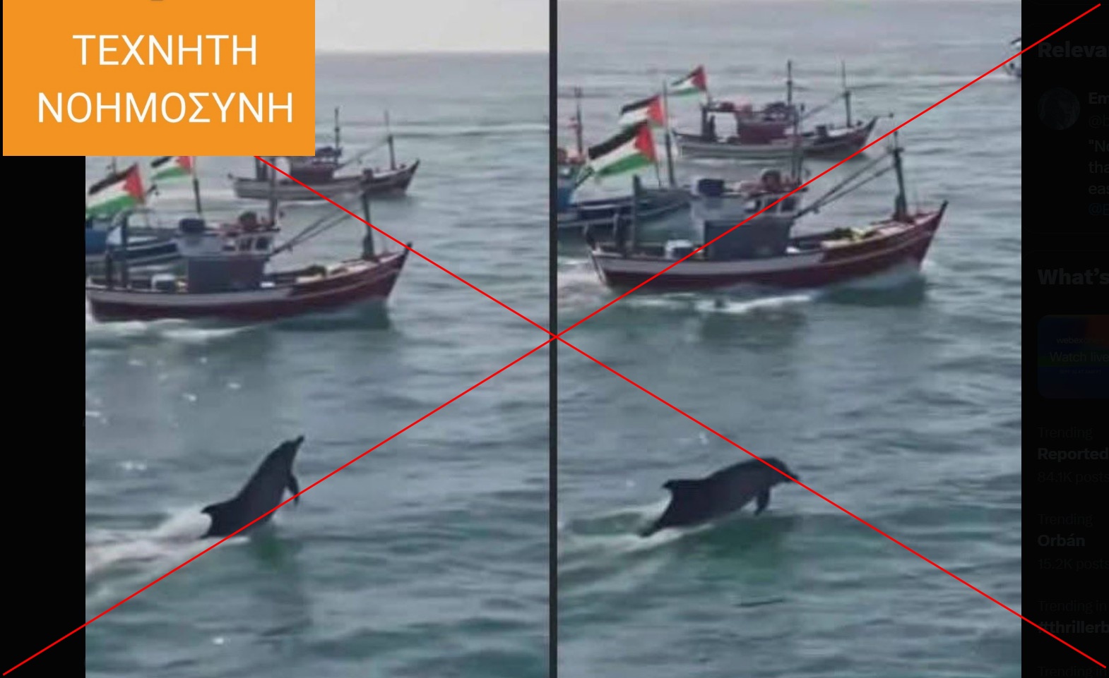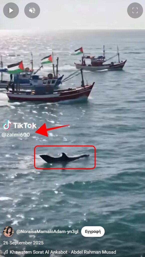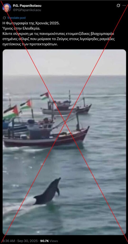 Η παρακάτω εικόνα συγκέντρωσε πάνω από 90 χιλιάδες θεάσεις στο X και 165 κοινοποιήσεις στο Facebook. Υποτίθεται πως δείχνει ένα δελφίνι να κολυμπά δίπλα από το στολίσκο Sumud Flotilla (ή ακριβέστερα Global Sumud Flotilla). Η ίδια εικόνα κυκλοφόρησε και στο εξωτερικό με εκατομμύρια θεάσεις. Ο Global Sumud Flotilla, είναι μια διεθνής πρωτοβουλία που ξεκίνησε τον Ιούλιο του 2025, με στόχο να σπάσει τον ισραηλινό αποκλεισμό της Λωρίδας της Γάζας. Ξεκίνησε στα τέλη Αυγούστου 2025 και πλησίασε τη Γάζα στις αρχές Οκτωβρίου. Ισραηλινές δυνάμεις προσέγγισαν και κατέλαβαν δεκάδες πλοία σε διεθνή ύδατα, συλλαμβάνοντας ακτιβιστές.