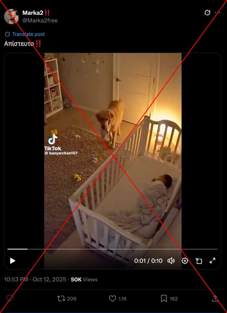 Αρχές Οκτωβρίου, ένα βίντεο στο Χ που φαίνεται να δείχνει έναν σκύλο να προστατεύει ένα μωρό από σεισμό συγκέντρωσε σχεδόν 100.000 προβολές και κοινοποιήθηκε πάνω από 300 φορές. Ο δημιουργός της ανάρτησης δεν αναφέρει πουθενά ότι πρόκειται για βίντεο που έχει δημιουργηθεί με τεχνητή νοημοσύνη.