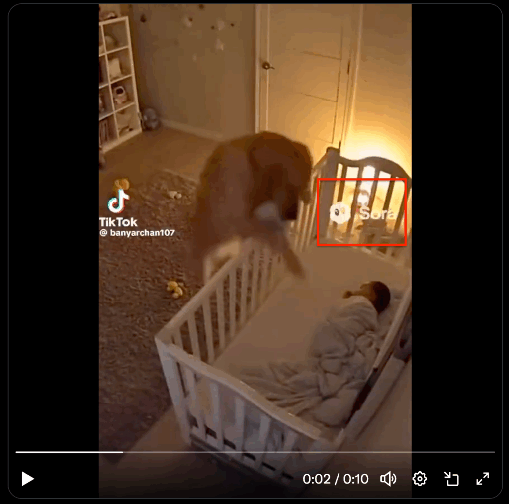 Μια προσεκτική παρατήρηση του βίντεο μας επιτρέπει να διαπιστώσουμε άμεσα ότι έχει παραχθεί μέσω της εφαρμογής Sora 2 της OpenAI: από το 0:02 του βίντεο εμφανίζεται το υδατογράφημα της Sora, όπως φαίνεται στην παρακάτω εικόνα: