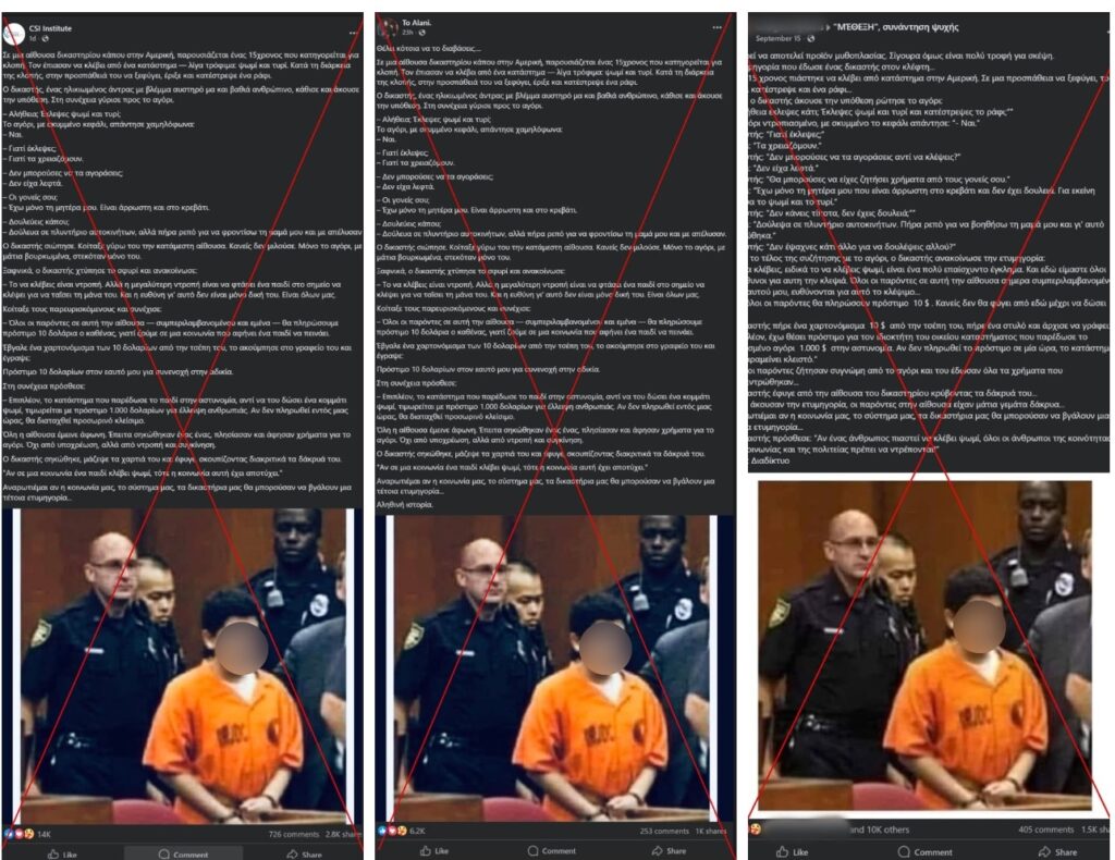 Πάνω από πέντε χιλιάδες κοινοποιήσεις έχουν συγκεντρώσει τρεις αναρτήσεις (εδώ, εδώ και εδώ) που παρουσιάζουν τη φωτογραφία ενός εφήβου με χειροπέδες σε δικαστήριο των ΗΠΑ. Μεταξύ άλλων, η ανάρτηση εμφανίστηκε και στο CSI Institute (Διεθνές Ινστιτούτο για την Κυβερνοασφάλεια).