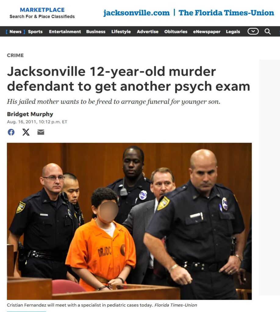 Πιο συγκεκριμένα, σε δημοσίευμα της ιστοσελίδας jacksonville.com (The Florida Times Union) με ημερομηνία 16 Αυγούστου 2011, διαβάζουμε πως τον Μάρτιο του 2011, ο 12χρονος Κρίστιαν Φερνάντεζ (Cristian Fernandez) συνελήφθη από το Γραφείο Σερίφη του Τζάκσονβιλ για τον θάνατο του διχρονου ετεροθαλή αδελφού του, Ντέιβιντ Γκαλαράγκα, ο οποίος υπέστη θανατηφόρα τραύματα, συμπεριλαμβανομένου κατάγματος κρανίου, όταν ο Φερνάντεζ φέρεται να τον χτύπησε σε βιβλιοθήκη στο διαμέρισμά τους στο Τζάκσονβιλ της Φλόριντα.