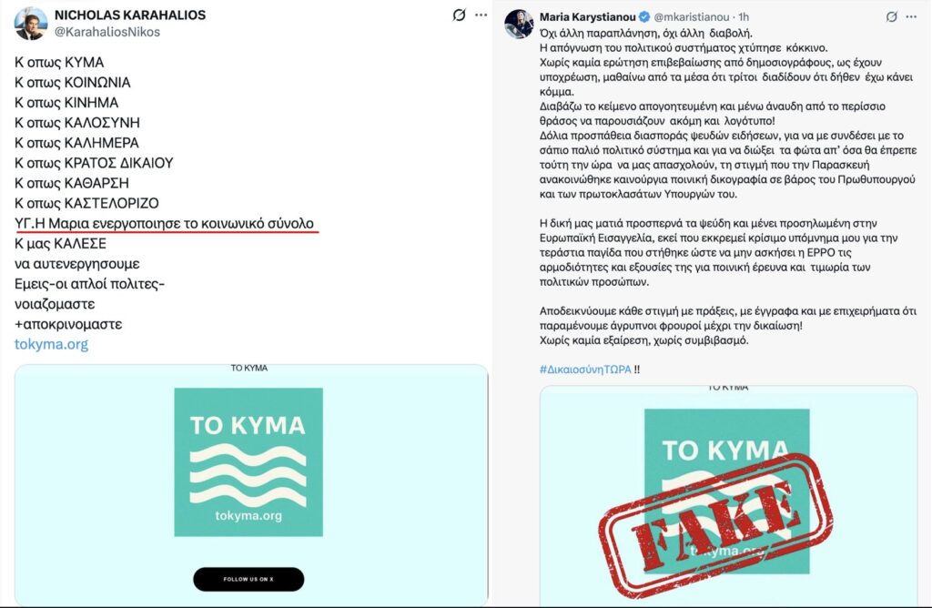 Τα τελευταία 24ωρα διακινήθηκε ο ισχυρισμός πως η Μαρία Καρυστιανού, ετοιμάζεται να ιδρύσει ένα νέο κόμμα με το όνομα “Κύμα”. Την 1η Νοεμβρίου 2025, εμφανίστηκε δημοσίευμα στο tvxs.gr, με τίτλο “Tvxs Αποκλειστικό / Αντίστροφη μέτρηση για το κόμμα Καρυστιανού – Θα ονομάζεται «Κύμα»“. Το άρθρο επισημαίνει πως:
