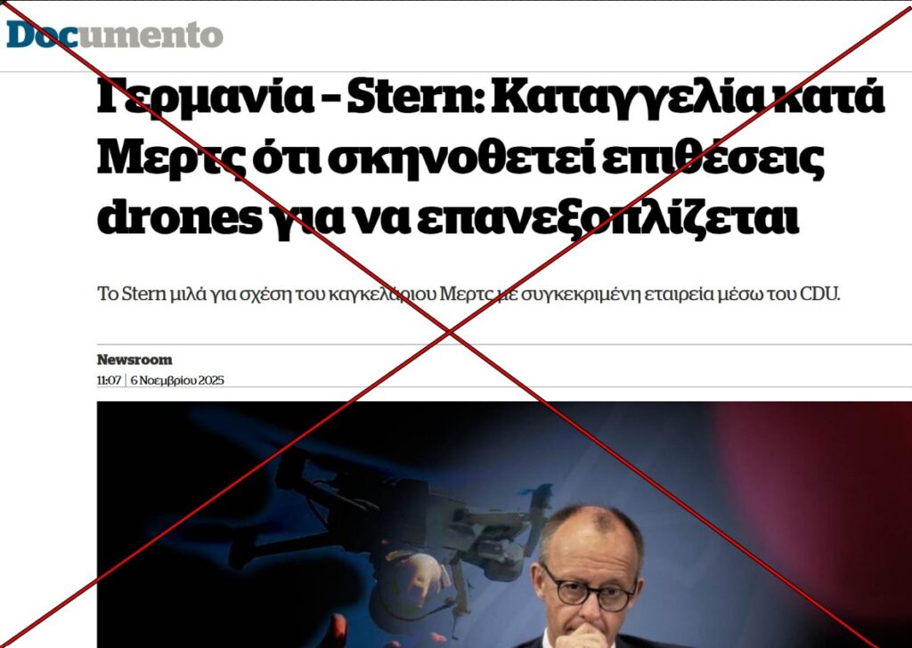 ΣΥΜΠΕΡΑΣΜΑ: Πρόκειται για ένα ψευδές και προπαγανδιστικό αφήγημα. Το περιοδικό Stern ουδέποτε έγραψε πως ο Γερμανός καγκελάριος “έστησε” τις επιθέσεις με drones για να κατηγορήσει τη Ρωσία. Ο ισχυρισμός προέρχεται από ιστοσελίδα που μιμείται το Stern.