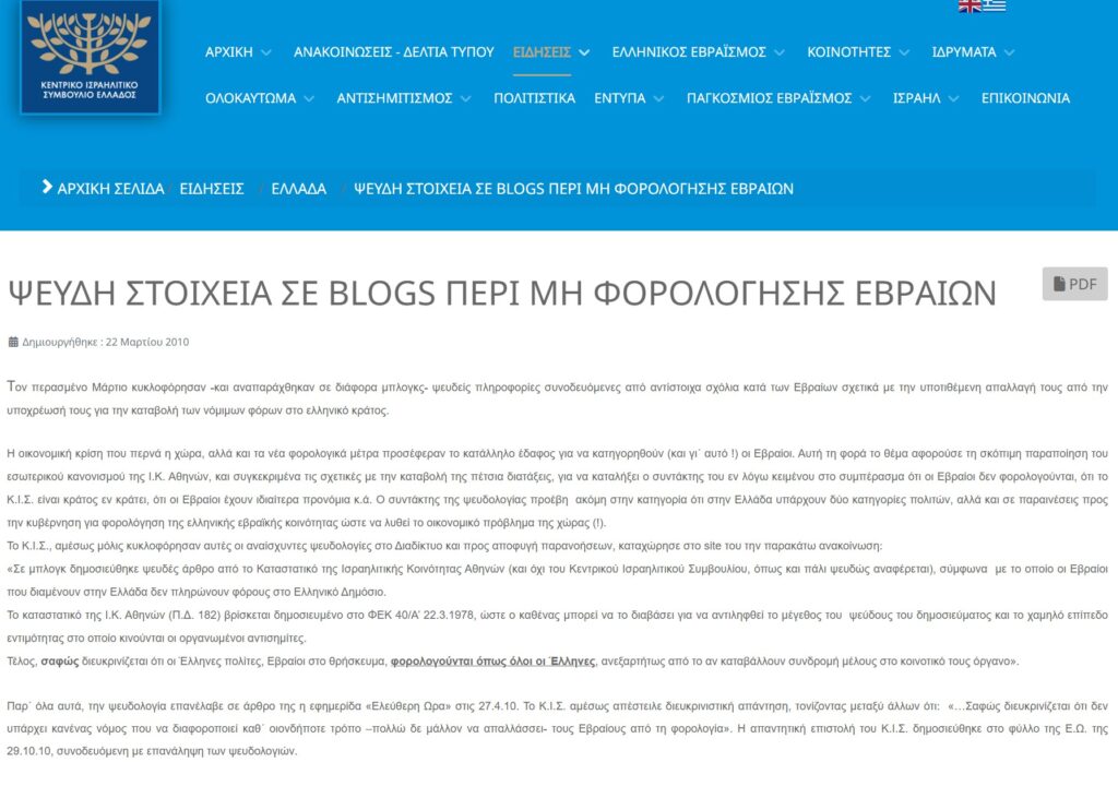 “Οι Έλληνες πολίτες εβραϊκού θρησκεύματος πληρώνουν κανονικά τους φόρους τους, όπως όλοι οι Έλληνες πολίτες, και δεν έχουν καμία φοροαπαλλαγή ή φορολογική επιβάρυνση εξαιτίας της θρησκευτικής τους ταυτότητας. Το ΚΙΣΕ και οι ισραηλιτικές κοινότητες φορολογούνται όπως ακριβώς και η Εκκλησία της Ελλάδος γιατί αμφότερες έχουν καθεστώς νομικού προσώπου δημοσίου δικαίου.“