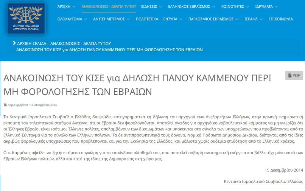 “Το Κεντρικό Ισραηλιτικό Συμβούλιο Ελλάδος διαψεύδει κατηγορηματικά τη δήλωση του αρχηγού των Ανεξαρτήτων Ελλήνων, στην πρωινή ενημερωτική εκπομπή του τηλεοπτικού σταθμού Αντέννα, ότι οι Εβραίοι δεν φορολογούνται. Αποτελεί όνειδος για αρχηγό κοινοβουλευτικού κόμματος να μη γνωρίζει ότι οι Έλληνες Εβραίοι είναι ισότιμοι Έλληνες πολίτες, απολαμβάνουν των δικαιωμάτων και υπόκεινται στο σύνολο των υποχρεώσεων που προβλέπονται από το Ελληνικό Σύνταγμα για το σύνολο των Ελλήνων πολιτών. Τα δε αντιπροσωπευτικά τους όργανα, Νομικά Πρόσωπα Δημοσίου Δικαίου, διέπονται από τις ίδιες ακριβώς φορολογικές υποχρεώσεις που προβλέπονται και για την Εκκλησία της Ελλάδος, και μάλιστα χωρίς ουδεμία επιδότηση από το Ελληνικό κράτος.“