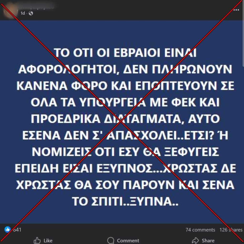 Άρχισε να διαδίδεται ξανά ο ισχυρισμός πως οι Εβραίοι απολαμβάνουν το προνόμιο να μην πληρώνουν φόρους στο Ελληνικό Κράτος.
