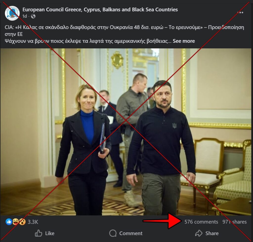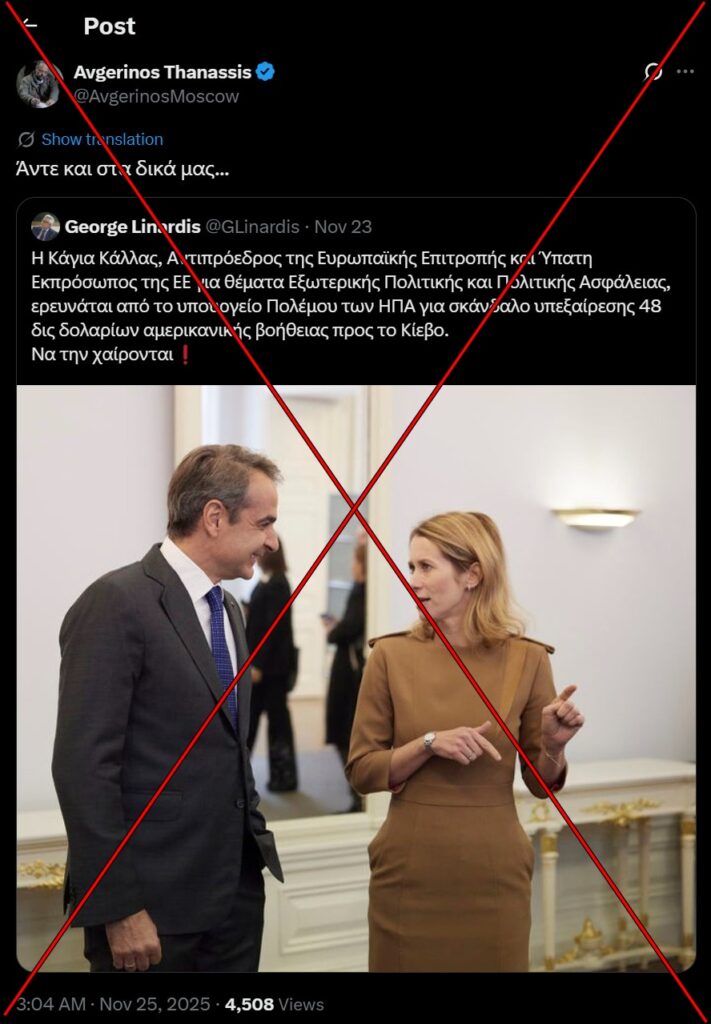 Τα τελευταία 24ωρα, διακινήθηκε ο ισχυρισμός πως η Κάγια Κάλας, Αντιπρόεδρος της Ευρωπαϊκής Επιτροπής και Ύπατη Εκπρόσωπος της Ένωσης για Θέματα Εξωτερικής Πολιτικής και Πολιτικής Ασφάλειας της Ευρωπαϊκής Ένωσης, ίσως να εμπλέκεται σε σκάνδαλο διαφθοράς στην Ουκρανία, ύψους 48 δισ. ευρώ.