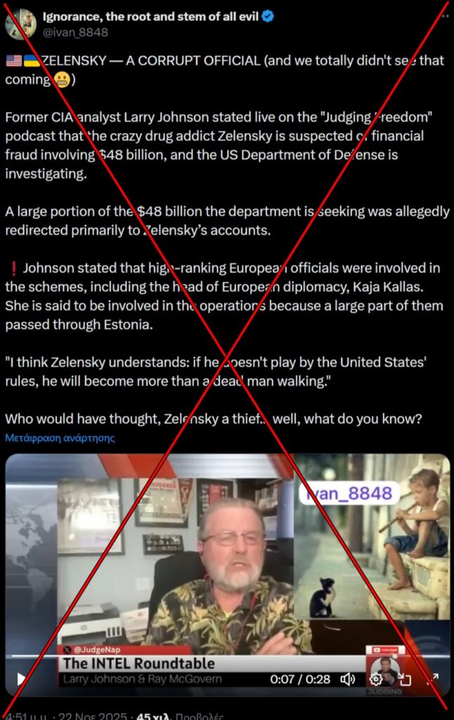 Το δημοσίευμα επικαλείται τα ανάρτηση στο X/Twitter με όσα φέρεται να είπε πρώην αναλυτή της CIA, που από το 1993, δεν σχετίζεται με τη συγκεκριμένη υπηρεσία. Η “είδηση” παρουσιάζει τον πρώην αναλυτή της CIA Λάρι Τζόνσον (Larry Johnson) να ισχυρίζεται ότι το Πεντάγωνο διεξάγει μυστική έρευνα για υπεξαίρεση 48 δισ. δολαρίων αμερικανικής βοήθειας προς την Ουκρανία, με χρήματα που, όπως λέει, κατέληξαν σε λογαριασμούς του Ζελένσκι και κυκλώματα στην Εσθονία. Ο Τζόνσον εμπλέκει και την Κάγια Κάλας, υποστηρίζοντας ότι υψηλόβαθμοι Ευρωπαίοι αξιωματούχοι συμμετείχαν στο σχέδιο. O Τζόνσον μιλάει για διοχέτευση χρημάτων μέσω εσθονικών τραπεζών. Ωστόσο, δεν παρέχει καμία απόδειξη για τους ισχυρισμούς που κάνει για την Κάγια Κάλας και τον Βολοντιμίρ Ζελένσκι. Αντιθέτως, ακούγεται να επαναλαμβάνει τη φράση “Δεν μπορείς να φανταστείς τέτοια πράγματα!” (“You can’t make this up!”).