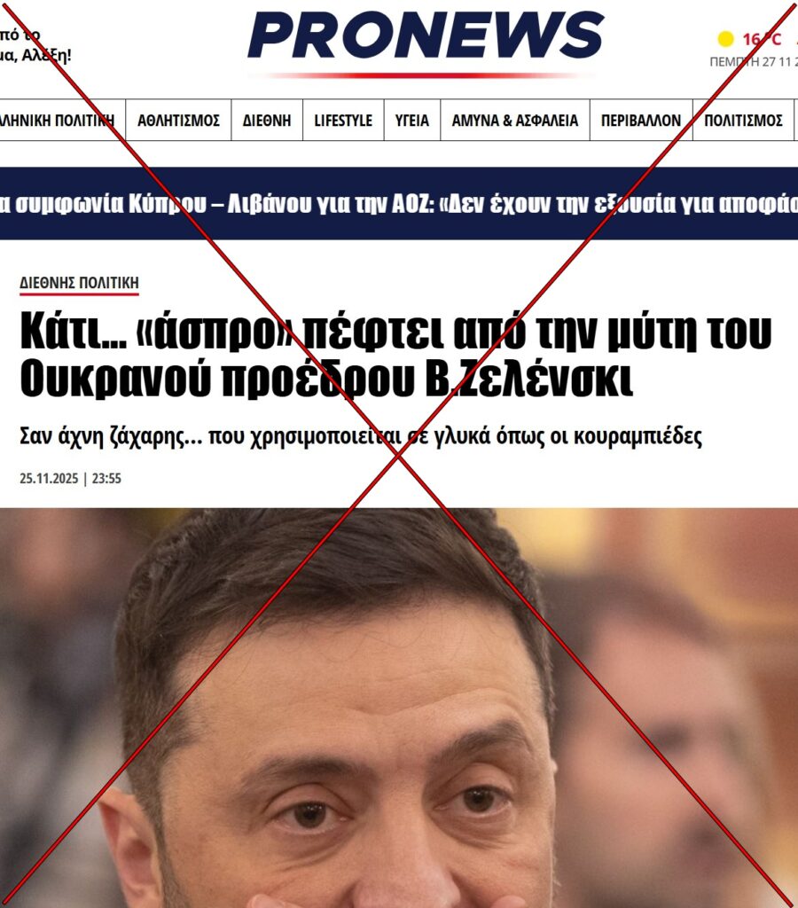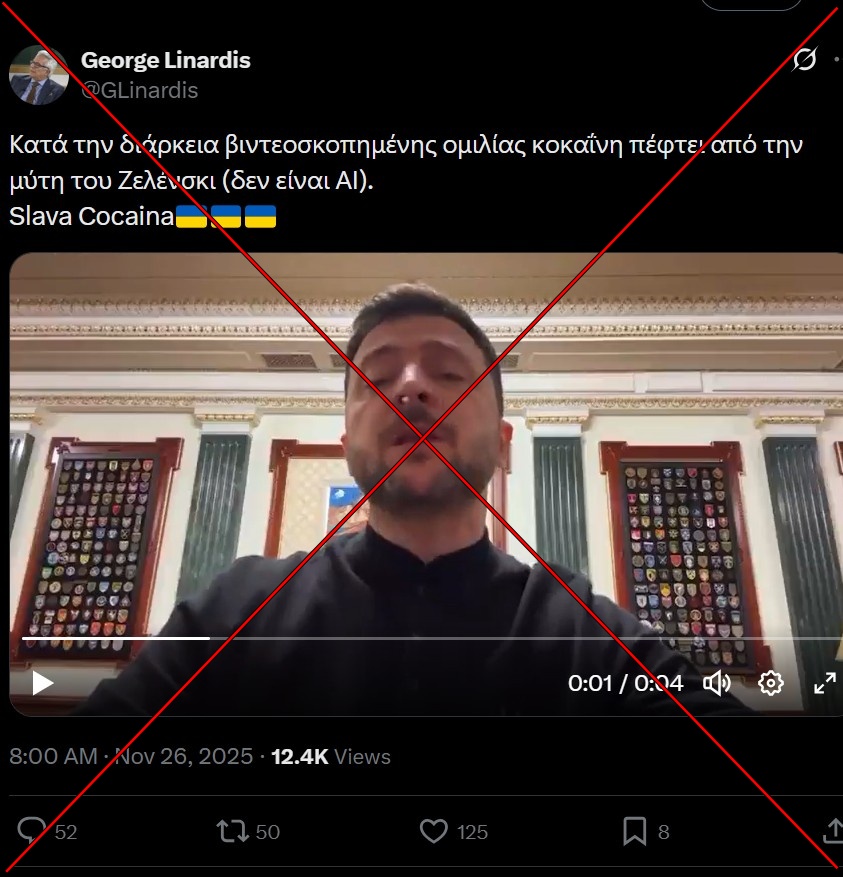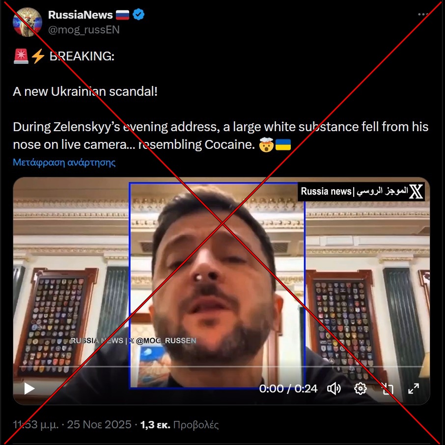 Το αφήγημα ότι ο Βολοντίμιρ Ζελένσκι κάνει χρήση κοκαΐνης, επαναλαμβάνεται τακτικά και αποτελεί καλά τεκμηριωμένο παράδειγμα παραπληροφόρησης, ενώ κάθε “απόδειξη” που έχει κυκλοφορήσει έχει καταρριφθεί. Βίντεο που υποτίθεται ότι δείχνουν κοκαΐνη πάνω στο γραφείο του κατά τη διάρκεια τηλεδιάσκεψης έχουν αποδειχθεί ψηφιακά αλλοιωμένα, καθώς η λευκή ουσία δεν υπήρχε στο αρχικό υλικό (VoxUkraine). Αντίστοιχα, μια “συνέντευξη” που διαδόθηκε στα κοινωνικά δίκτυα και παρουσίαζε τον Ζελένσκι να παραδέχεται υποτιθέμενη χρήση ναρκωτικών ήταν στην πραγματικότητα παραπλανητικά μονταρισμένη. Η συγκεκριμένη αφήγηση είναι μέρος μιας ευρύτερης στρατηγικής που έχει παρατηρηθεί επανειλημμένα σε φιλορωσικούς κύκλους και στη ρωσική κρατική προπαγάνδα. Στόχος είναι η υπονόμευση της προσωπικής αξιοπιστίας του Ζελένσκι μέσα από διαρκή αμφισβήτηση του χαρακτήρα του και των ικανοτήτων του. Πρόκειται για μια δοκιμασμένη τακτική αποπροσανατολισμού που επιδιώκει να πλήξει όχι μόνο τον ίδιο, αλλά και τη δημόσια υποστήριξη προς την Ουκρανία.