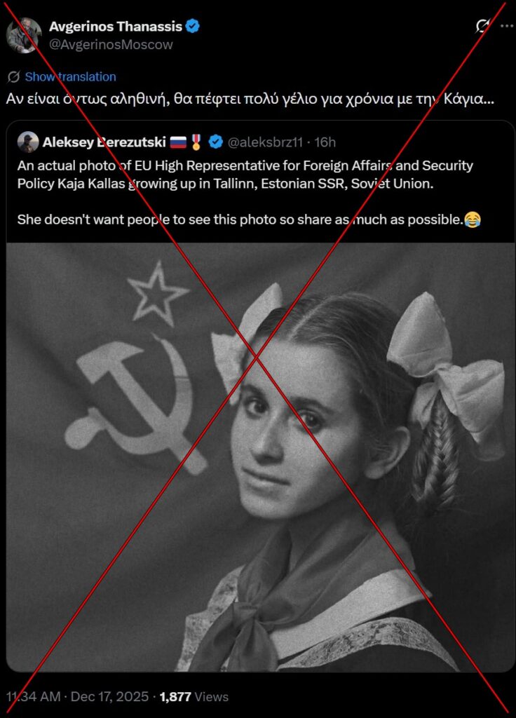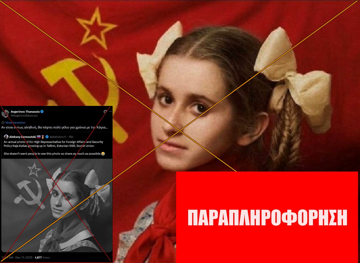 Η υποτιθέμενη φωτογραφία της Κάγια Κάλας να ποζάρει μπροστά από τη σημαία της Σοβιετικής Ένωσης, προέρχεται από κακόβουλη τροποποίηση φωτογραφίας που κυκλοφορεί από το 2016 και απεικονίζει άλλο πρόσωπο.
