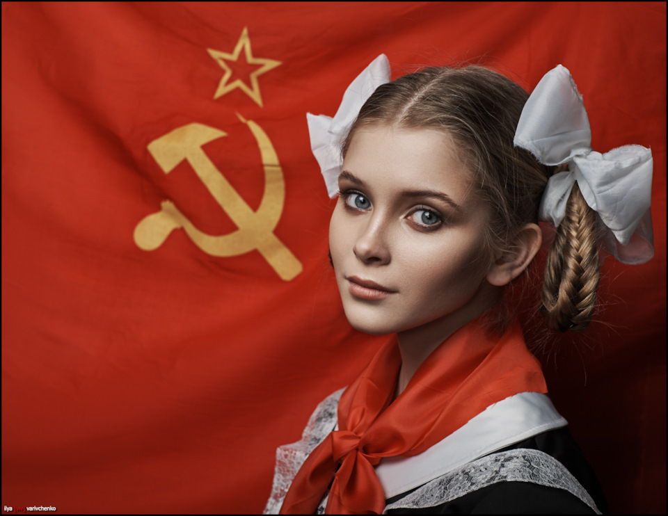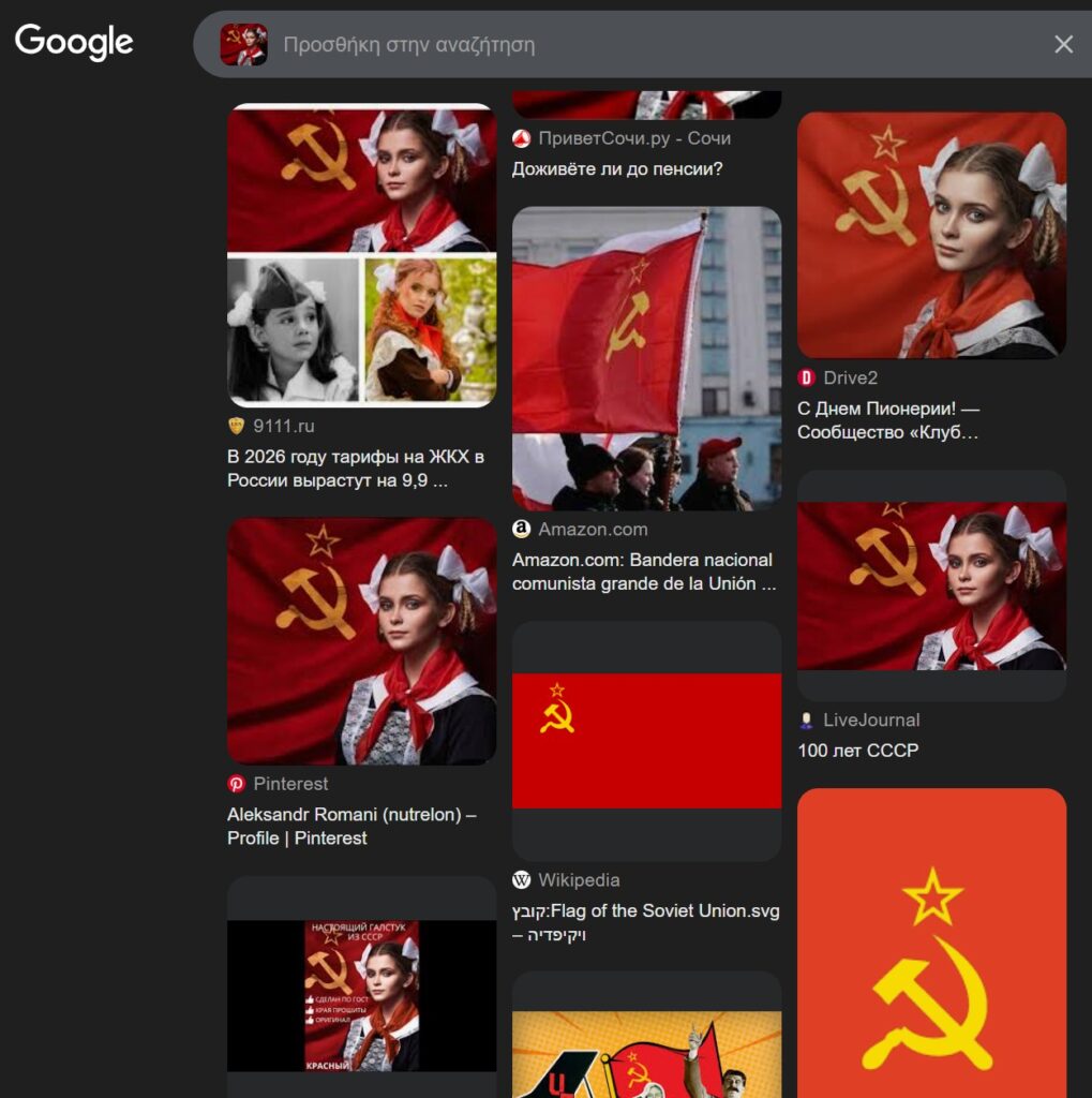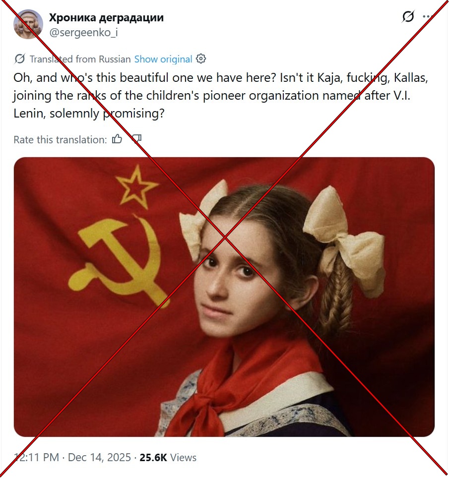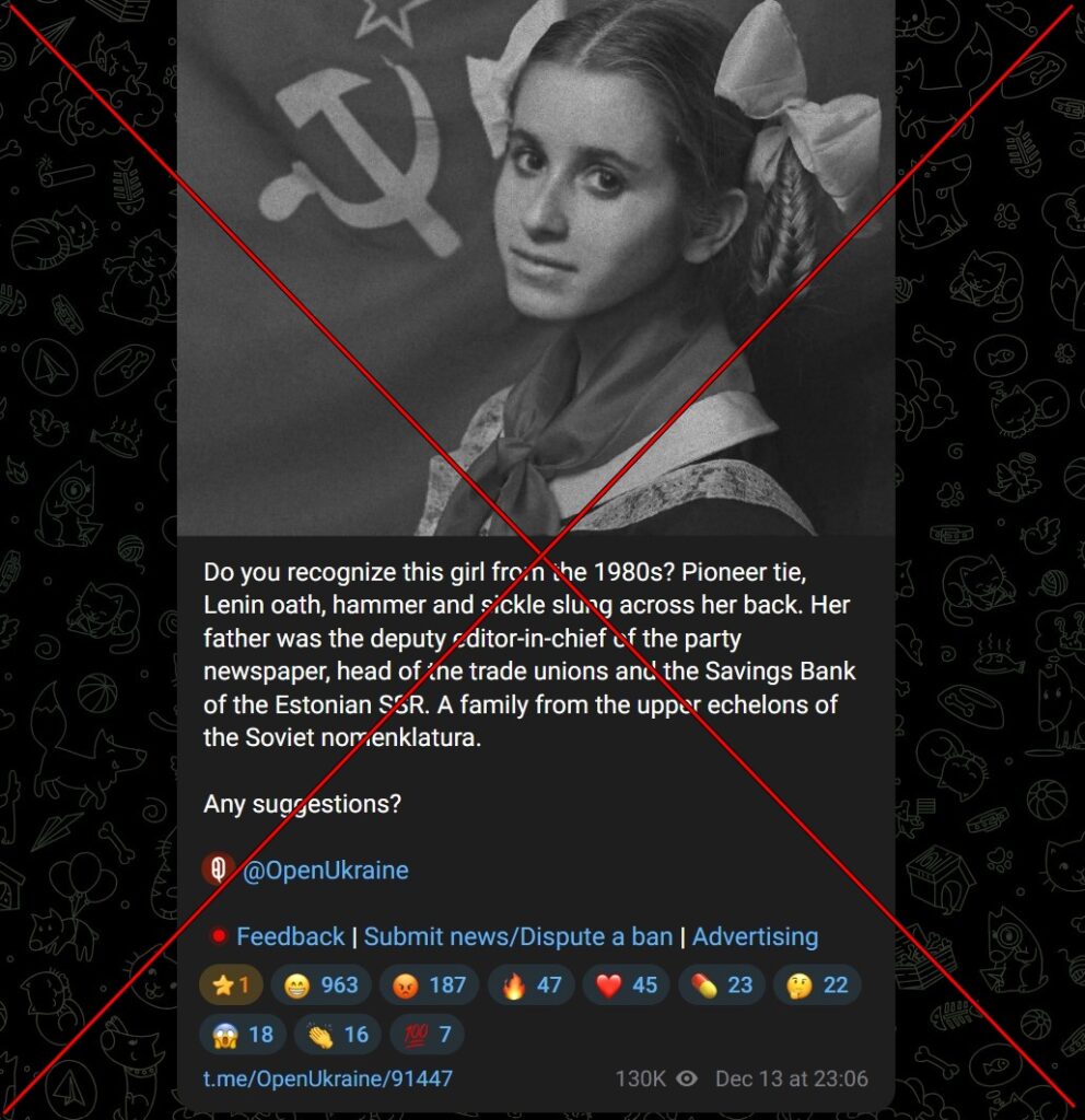 Η “φωτογραφία της Κάγια Κάλας” (κέντρο), αποτελεί τροποποίηση εικόνων (εδώ και εδώ) του Ilya Varivchenko που κυκλοφορούν από το 2016. Σε κάθε περίπτωση, η εικόνα είναι ένα πορτρέτο ενός νεαρού κοριτσιού με σχολική στολή της σοβιετικής εποχής, με φόντο τη σημαία της Σοβιετικής Ένωσης.
