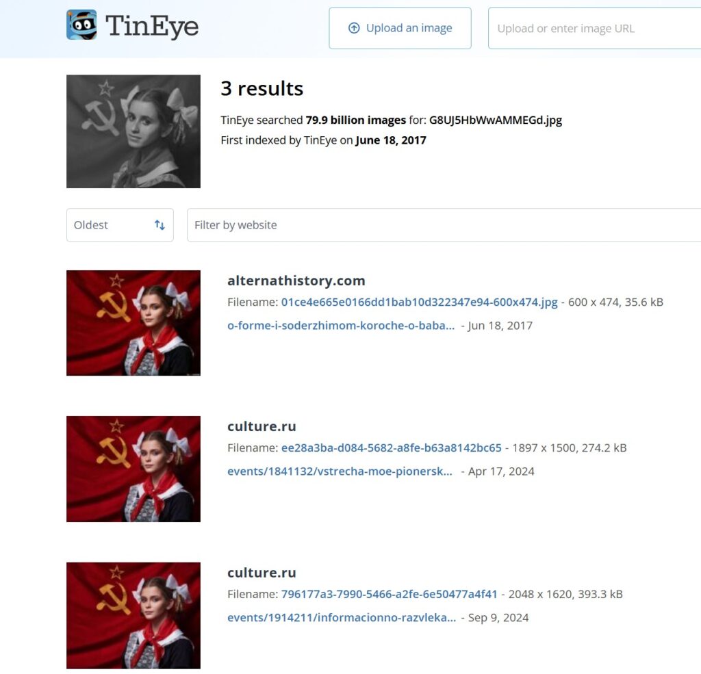 Κάναμε αντίστροφη αναζήτηση της εικόνας μέσω του TinEye και της Google, παίρνοντας τα παρακάτω αποτελέσματα, δηλαδή μια σειρά εικόνων που μοιάζουν με αυτή που εξετάζουμε, αλλά δεν είναι ακριβώς ίδιες στο πρόσωπο: