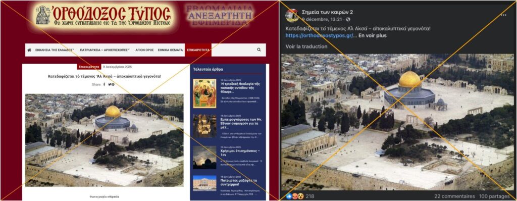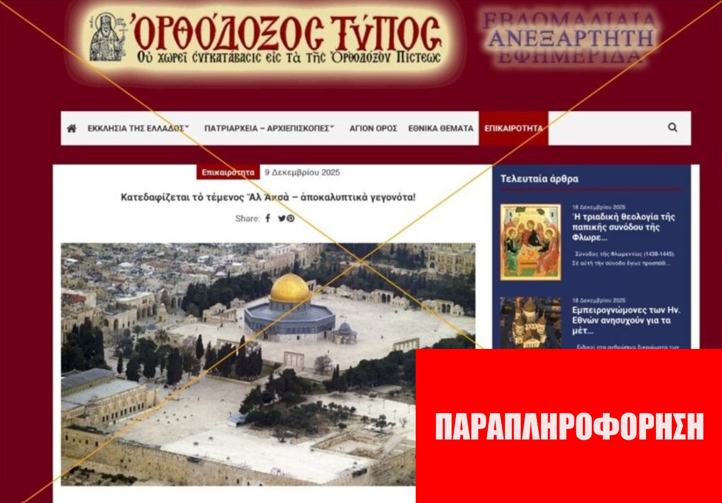 Αρχές Δεκεμβρίου, άρθρο που δημοσιεύτηκε στον ιστότοπο orthodoxostypos.gr έφερε τον τίτλο «Κατεδαφίζεται τὸ τέμενος Ἄλ Ἀκσὰ – ἀποκαλυπτικὰ γεγονότα!». Στις πρώτες γραμμές του άρθρου αναφέρεται ότι «σύντομα» το τέμενος Αλ Άκσα θα «μεταβληθεί σε ερείπια» και στη θέση του θα ανεγερθεί «ο τρίτος ναός των Εβραίων».