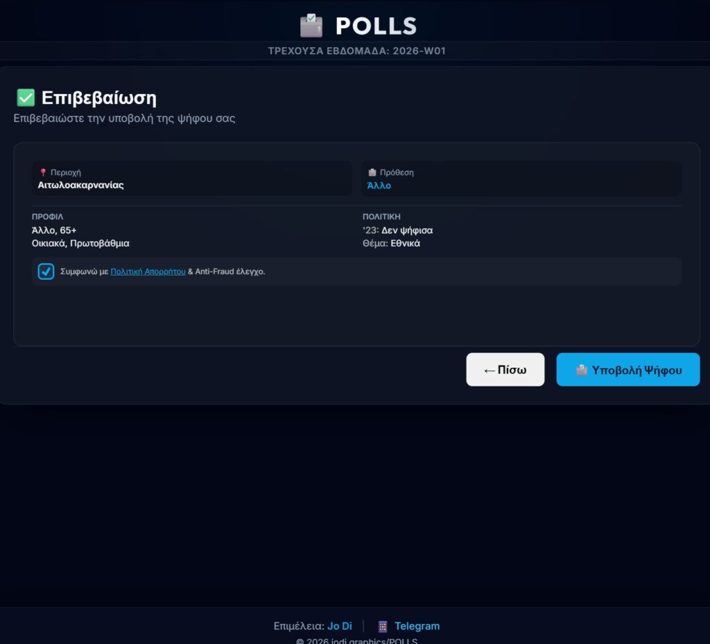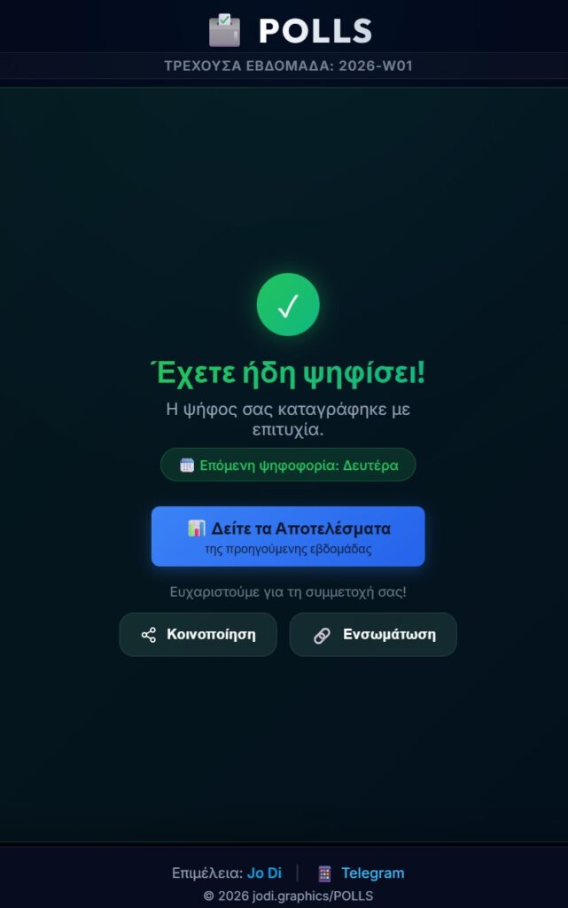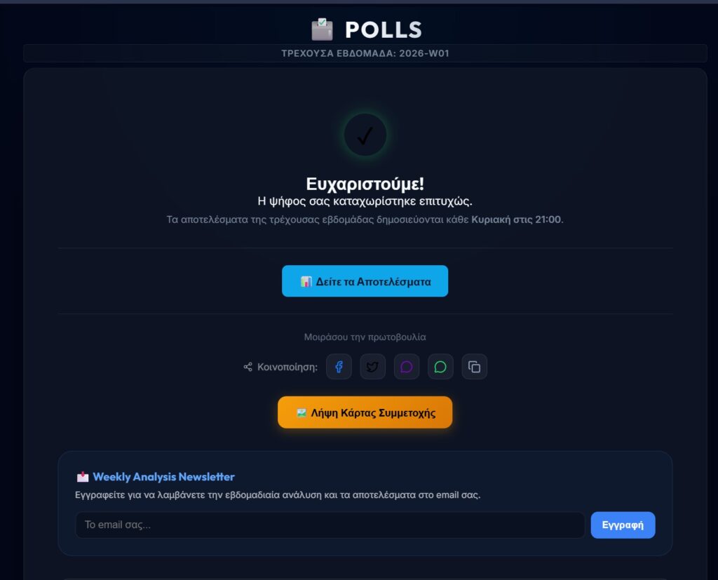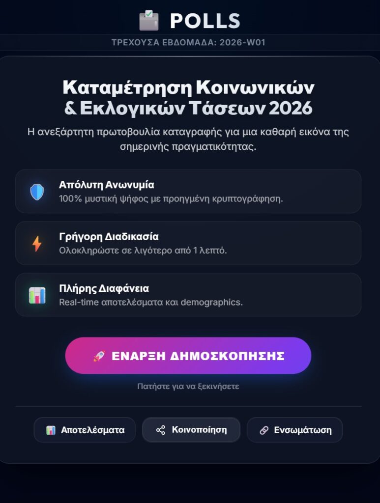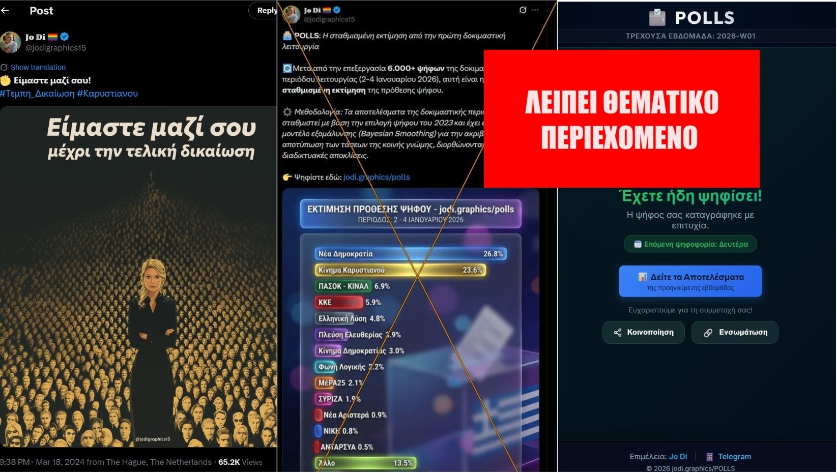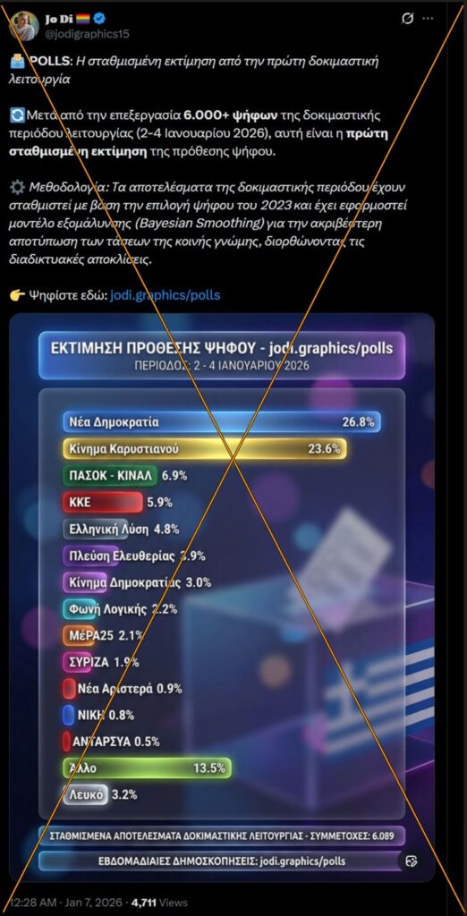 ΣΥΜΠΕΡΑΣΜΑ: Η συγκεκριμένη “δημοσκόπηση” δεν μπορεί να θεωρηθεί αξιόπιστη εκτίμηση πρόθεσης ψήφου για τον γενικό πληθυσμό. Πρόκειται για μια online ψηφοφορία χωρίς επιστημονική μεθοδολογία, χωρίς έλεγχο συμμετοχής, χωρίς αντιπροσωπευτικό δείγμα και με σοβαρές δυνατότητες πολλαπλής ψήφου και χειραγώγησης. Οι αριθμοί που προκύπτουν δεν είναι αντιπροσωπευτικοί, αλλά δείχνουν τις τάσεις μιας περιορισμένης ψηφιακής κοινότητας σε μια συγκεκριμένη χρονική στιγμή. Ως εκ τούτου, η παρουσίαση ή αναπαραγωγή τους ως “δημοσκόπηση” ή ως ένδειξη πολιτικής δυναμικής στερείται σοβαρού θεματικού περιεχομένου και ως εκ τούτου, είναι παραπλανητική.