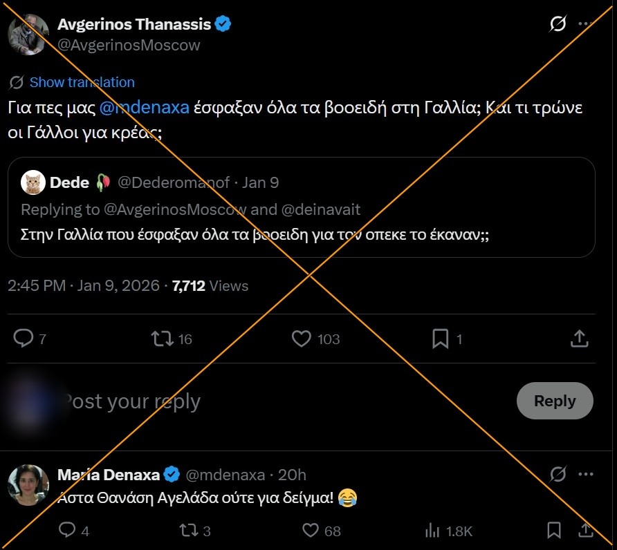Ο ισχυρισμός αναπαράχθηκε από τους δημοσιογράφους Θανάση Αυγερινό και Μαρία Δεναξά, που αμφότεροι έχουν ξαναπαραπληροφορήσει στο παρελθόν. Δείτε αντίστοιχα εδώ και εδώ.