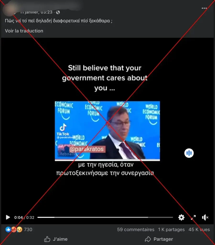 Μια αντίστροφη αναζήτηση βίντεο μάς επέτρεψε να εντοπίσουμε το αρχικό βίντεο στο YouTube, με ημερομηνία 25 Μαΐου 2022. Με τίτλο «Conversation with Albert Bourla, CEO of Pfizer», πρόκειται για μια συζήτηση με τον διευθύνοντα σύμβουλο της Pfizer, στο πλαίσιο του WEF 2022 στο Νταβός (αρχειοθετημένο εδώ), στην Ελβετία.