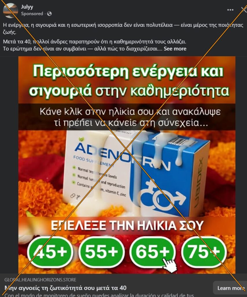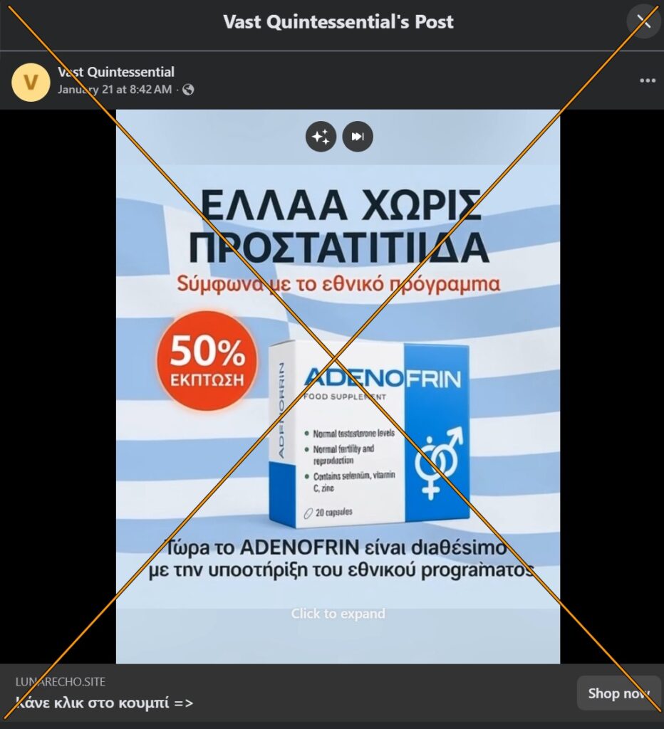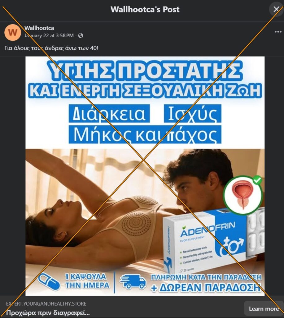 Το ADENOFRIN προωθείται στο διαδίκτυο ως “φυσικό” συμπλήρωμα διατροφής που υποτίθεται ότι βελτιώνει τη σεξουαλική απόδοση, αυξάνει την τεστοστερόνη, ενισχύει την ενέργεια και υποστηρίζει την υγεία του προστάτη. Ωστόσο, οι ισχυρισμοί αυτοί δεν στηρίζονται σε αξιόπιστα επιστημονικά δεδομένα και, με βάση όσα είναι σήμερα γνωστά, το προϊόν δεν μπορεί να κάνει όσα υπόσχεται. Οι σελίδες που το προωθούν έχουν μηδενικούς ακόλουθους και οι διαχειριστές είναι άτομα από το εξωτερικό. Ακολουθούν παραδείγματα: