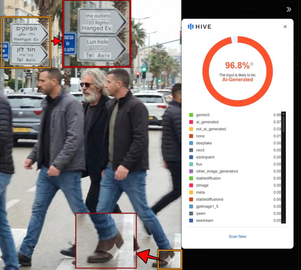 Εκ πρώτης όψεως, μπορούμε να διακρίνουμε ότι το πρόσωπο του “Έπσταϊν” μοιάζει υπερβολικά “καθαρό” σε σχέση με αυτούς που τον συνοδεύουν. Επιπλέον, κάναμε αντίστροφη αναζήτηση εικόνας στην Google, όπου διαπιστώσαμε πως η εικόνα, είναι στην πραγματικότητα μεγαλύτερη. Βρήκαμε ολόκληρη την εικόνα και την εξετάσαμε το το εργαλείο HIVE AI, που μας έδωσε 96,8% να είναι δημιουργημένη με τεχνητή νοημοσύνη. Παράλληλα, προσέξαμε το σήμα του Google Gemini κάτω δεξιά (πορτοκαλί πλαίσιο) και μεγεθυμένο να φαίνεται καλύτερα (κόκκινο πλαίσιο). To Gemini μπορεί να δημιουργεί αληθοφανείς εικόνες AI. Τέλος, οι πινακίδες πάνω αριστερά (πορτοκαλί πλαίσιο), διαθέτουν εβραϊκό κείμενο που είναι ασυνάρτητο όταν το μεταφράσουμε στα αγγλικά.