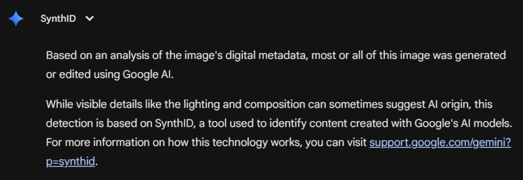 Τέλος, αναλύοντας την εικόνα μέσω του Gemini και του ειδικού εργαλείου SynthID που παρέχει, βλέπουμε ότι έχει δημιουργηθεί AI της Google: