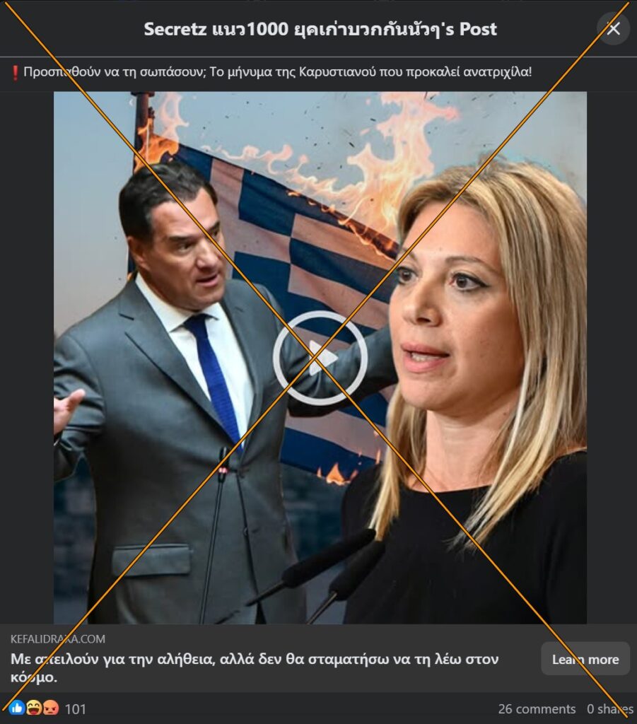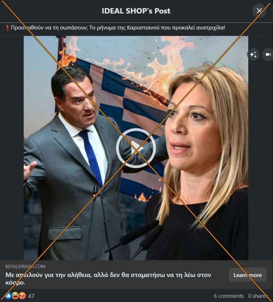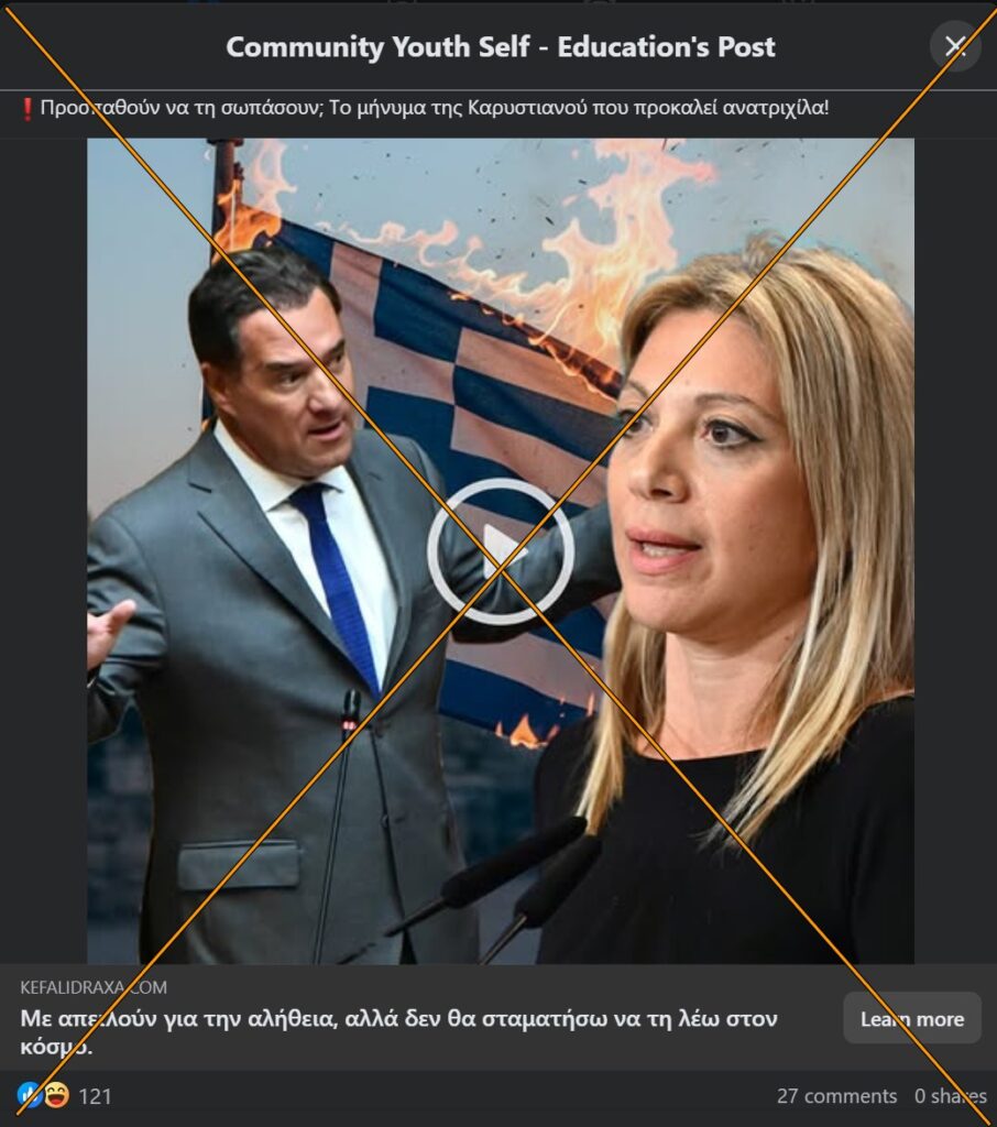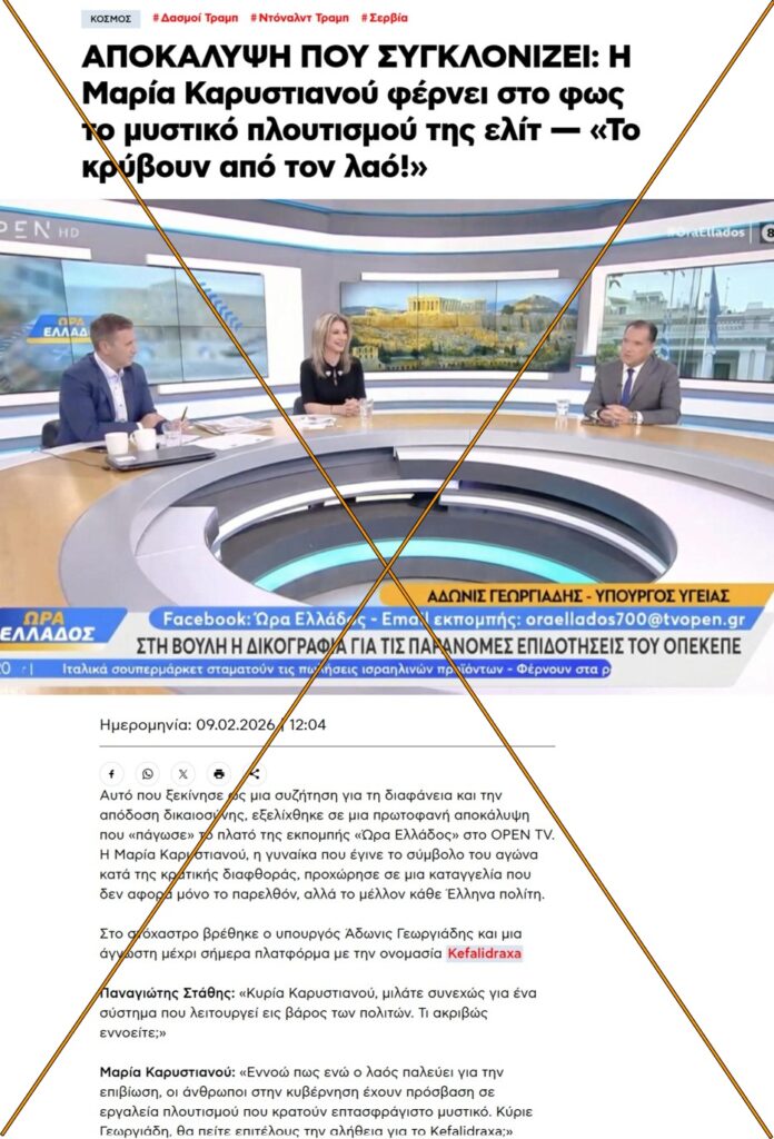 ΣΥΜΠΕΡΑΣΜΑ: Πρόκειται για κλασική περίπτωση απάτης. Η Μαρία Καρυστιανού ουδέποτε μίλησε για την πλατφόρμα Kefalidraxa. Η ιστοσελίδα είναι φτιαγμένη για να μοιάζει με αυτή του Πρώτου Θέματος, ή άλλου γνωστού media και η όλη συνέντευξη και συνομιλία με τους παρουσιαστές και τον Άδωνι Γεωργιάδη, είναι πλαστές.