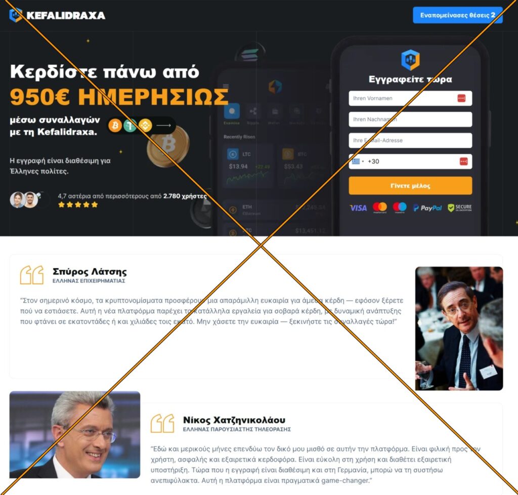 Η πλατφόρμα ονομάζεται Kefalidraxa και μέσα στα άρθρα των πλαστών ιστοσελίδων, υπάρχουν λινκς που παραπέμπουν σε αυτή. Υπόσχονται υπέρογκα κέρδη και έχουν ακόμη και ψεύτικες δηλώσεις γνωστών προσωπικοτήτων, που δήθεν κέρδισαν μεγάλα ποσά.