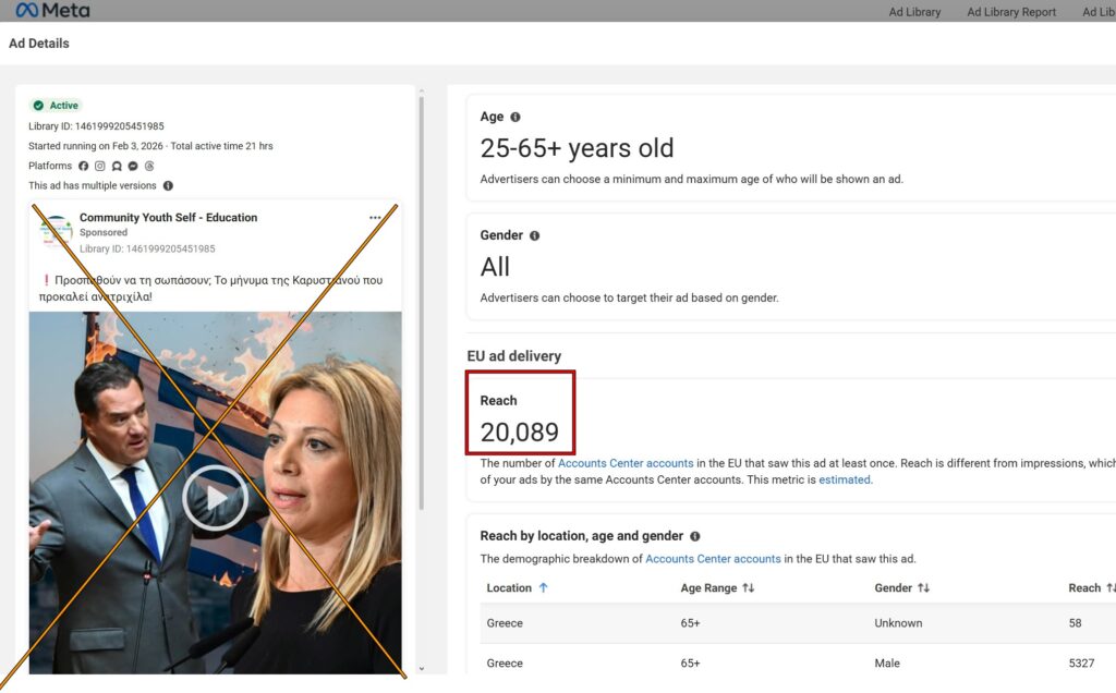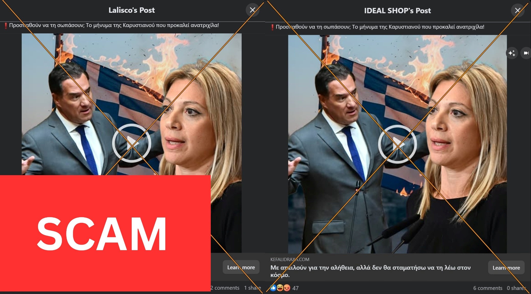 Οι ανωτέρω αναρτήσεις (δείτε τες αρχειοθετημένες εδώ, εδώ, εδώ και εδώ), παραπέμπουν σε φαινομενικά έγκυρα ενημερωτικά μέσα, όπως το Πρώτο Θέμα. Πληρώνουν τη Meta για να διαφημίσουν τις συγκεκριμένες αναρτήσεις, για να προσεγγίσουν περισσότερα υποψήφια θύματα. Σε κάθε περίπτωση, οι διαχειριστές των σελίδων με τις διαφημίσεις, δεν βρίσκονται στην Ελλάδα αλλά σε χώρες όπως το Βιετνάμ και η Ταϊλάνδη. Με τη βοήθεια της τεχνητής νοημοσύνης, μπορούν να δημιουργήσουν με ευκολία περιεχόμενο (κείμενο, εικόνες) που στοχεύει άλλες χώρες. Ακολουθεί παράδειγμα: