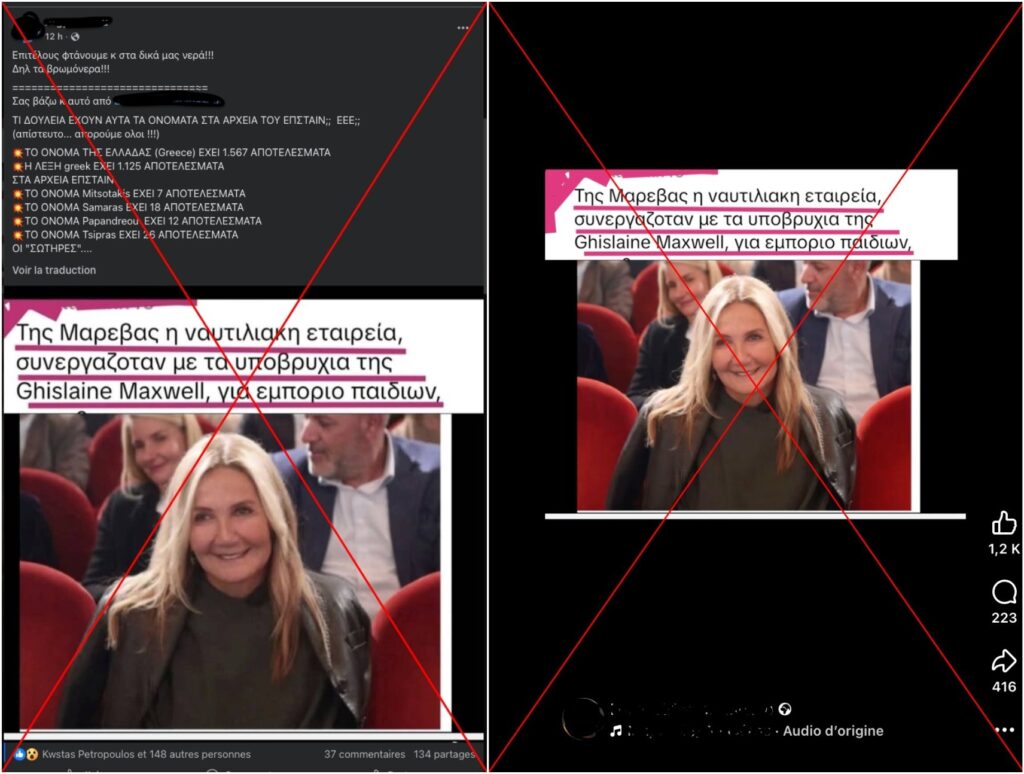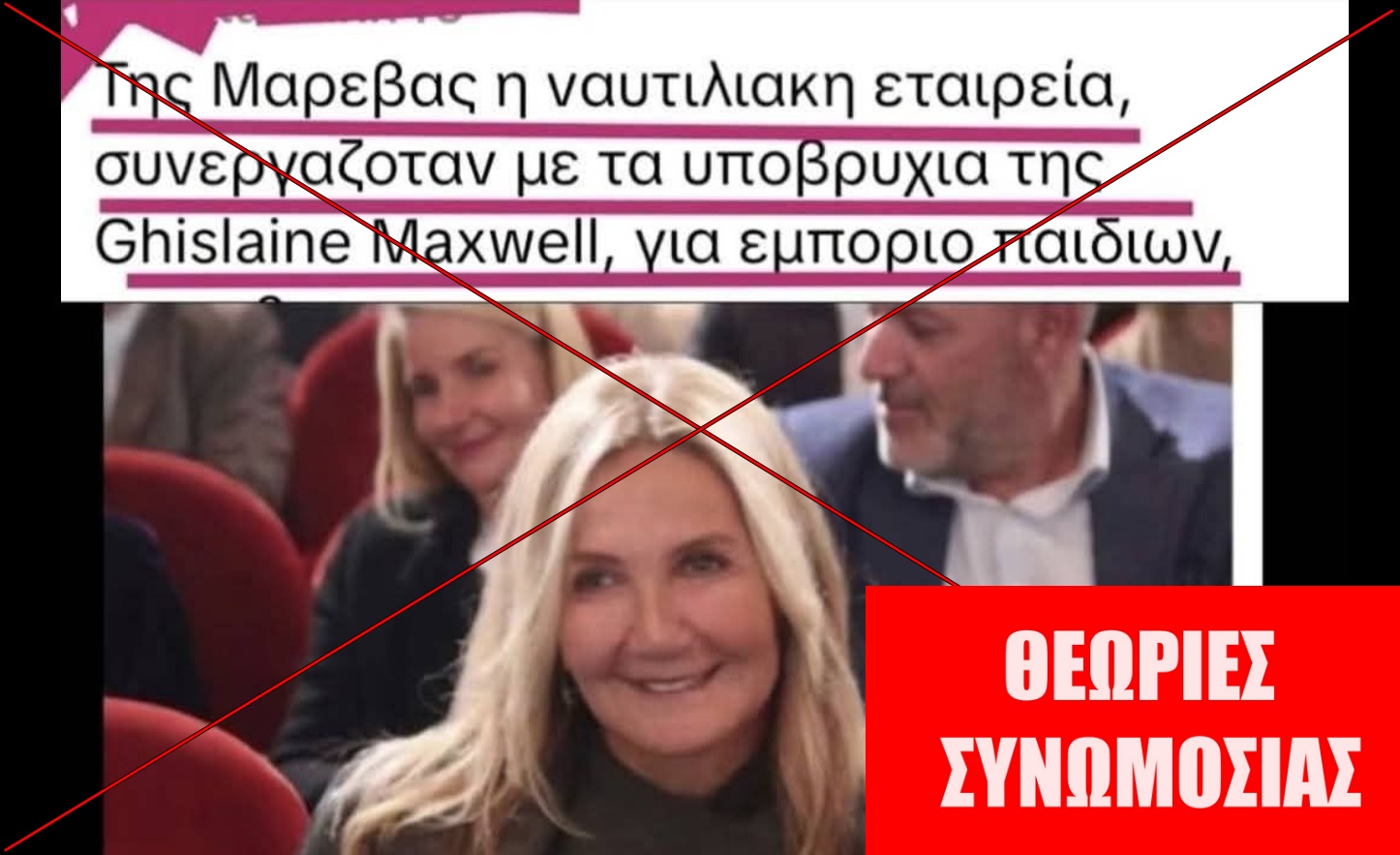Στο πλαίσιο αυτό, τον Φεβρουάριο του 2026, ανάρτηση στο Facebook κοινοποίησε φωτογραφία της Μαρέβας Γκραμπόφσκι-Μητσοτάκη, σύζυγος του Κυριάκου Μητσοτάκη, συνοδευόμενη από τον ισχυρισμό ότι είχε «συνεργαστεί» μέσω «ναυτιλιακής εταιρείας» με τα «υποβρύχια της Γκισλέιν Μάξγουελ για εμπόριο παιδιών». Στην εικόνα αναγραφόταν: «Της Μαρέβας η ναυτιλιακή εταιρεία συνεργαζόταν με τα υποβρύχια της Ghislaine Maxwell για εμπόριο παιδιών». Η Γκισλέιν Μάξγουελ ήταν η σύντροφος του Τζέφρι Έπσταϊν, και καταδικάστηκε σε 20 χρόνια φυλάκισης (αρχειοθετημένο εδώ) για τη σεξουαλική κακοποίηση ανηλίκων.