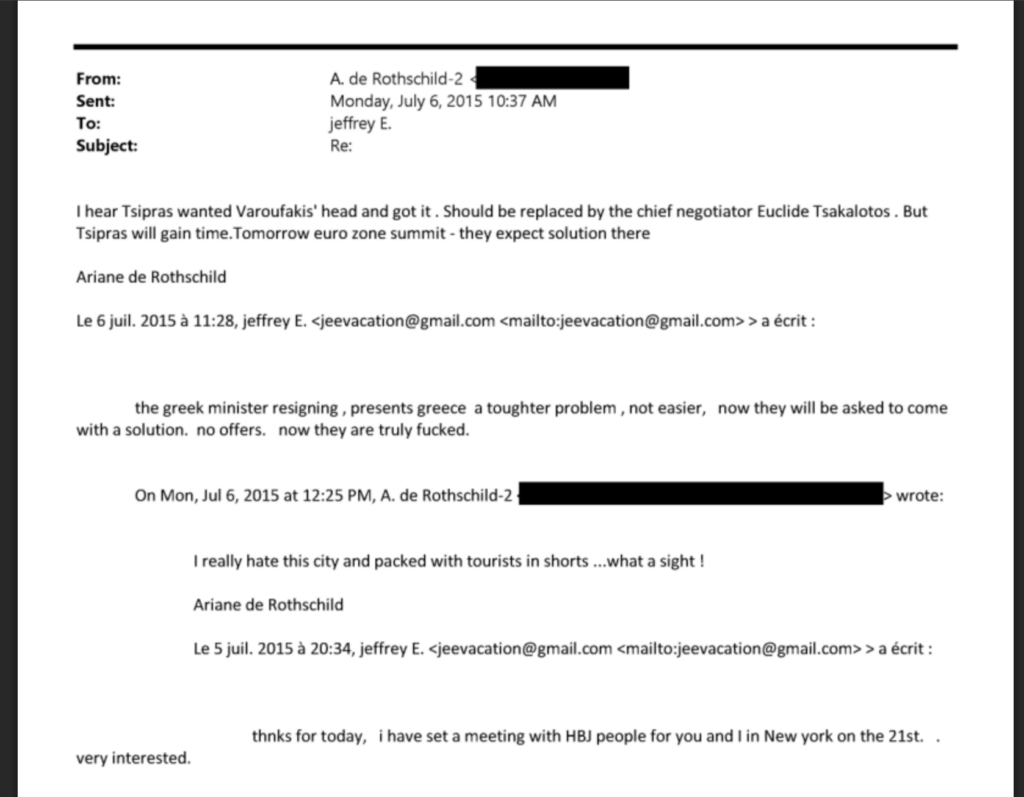 Το όνομα του Αλέξη Τσίπρα εμφανίζεται 26 φορές. Ωστόσο, ο πρώην πρωθυπουργός αναφέρεται και σε ηλεκτρονική αλληλογραφία της 6ης Ιουλίου 2015 μεταξύ του Τζέφρι Έπσταϊν και της Γαλλίδας τραπεζίτισσας Αριάν ντε Ροτσιλντ, η οποία διατηρούσε στενές σχέσεις με τον δισεκατομμυριούχο. Η αναφορά στον Αλέξη Τσίπρα γίνεται περιγραφικά, στο πλαίσιο της ελληνικής κρίσης, χωρίς άμεση επικοινωνία.