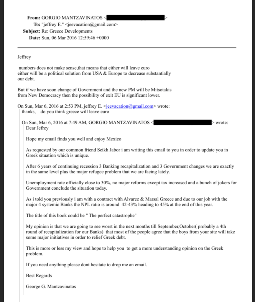 Η αναφορά στα συγκεκριμένα ονόματα προέρχεται κυρίως από ενημερωτικά δελτία που λάμβανε ο Τζέφρι Έπσταϊν, ιδίως κατά την περίοδο της κρίσης στην Ελλάδα, καθώς και από emails στα οποία τα ονόματα αυτά μνημονεύονταν χωρίς να υπάρχει άμεση επικοινωνία.