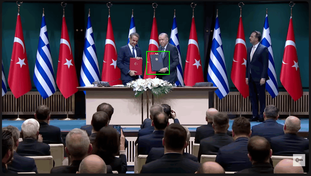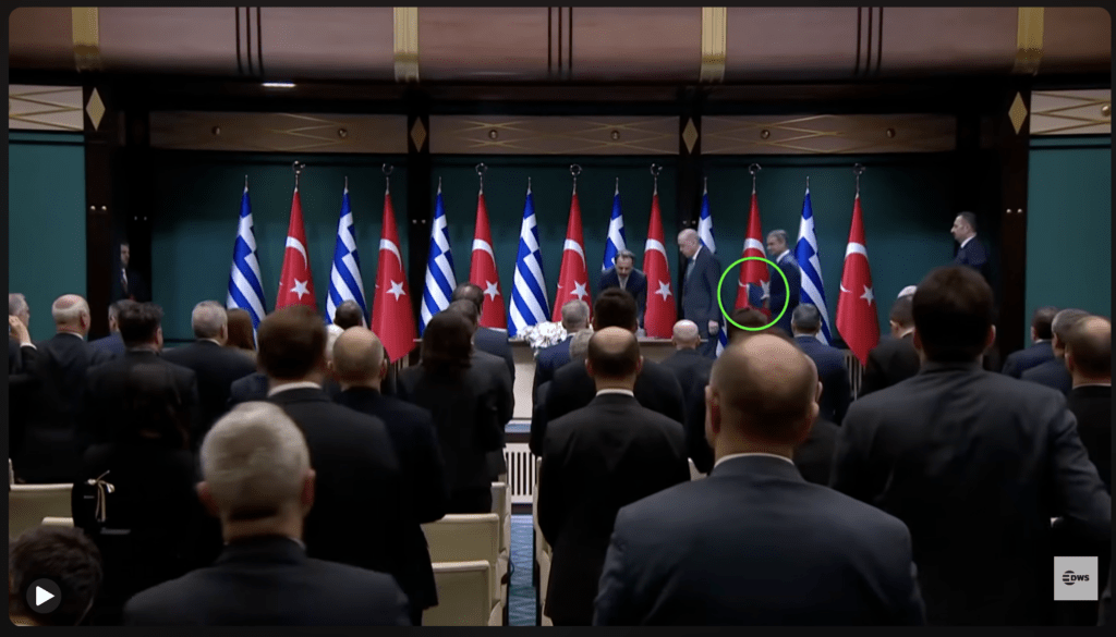 Ξεκινά με τους δύο ηγέτες να εισέρχονται στην αίθουσα, ενώ οι δημοσιογράφοι και οι παρευρισκόμενοι υπουργοί σηκώνονται όρθιοι. Tο απόσπασμα μεταξύ 0:09 και 0:20 δείχνει τον Κυριάκο Μητσοτάκη να μπαίνει στην αίθουσα, συνοδευόμενος από τον Ρετζέπ Ταγίπ Ερντογάν, κρατώντας στα χέρια του έναν μπλε φάκελο, τον οποίο τοποθετεί μπροστά του όταν παίρνει τη θέση του. Ο φάκελος αυτός είναι ορατός στο στιγμιότυπο οθόνης που ακολουθεί: