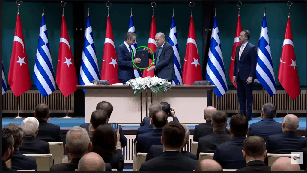 Επιπλέον, μεταξύ 5:46 και 6:56, οι δύο ηγέτες υπογράφουν τις τελικές συμφωνίες. Οι σχετικοί φάκελοι — ο ένας σκούρος μπλε με το εθνόσημο της Ελλάδας και ο άλλος κόκκινος με το εθνόσημο της Τουρκίας — τους προσκομίζονται από μέλη του επιτελείου. Υπογράφονται από τον Μητσοτάκη και τον Ερντογάν και στη συνέχεια ανταλλάσσονται μεταξύ των δύο ηγετών, όπως φαίνεται στα στιγμιότυπα οθόνης που ακολουθούν: