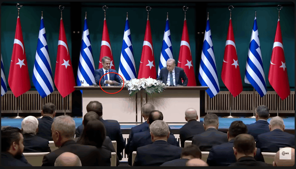 Τέλος, στο 25:05, πριν σφίξει το χέρι του Τούρκου προέδρου, ο πρωθυπουργός φαίνεται να παίρνει ξανά το χαρτομάντιλο που είχε τοποθετήσει μέσα στον φάκελο.