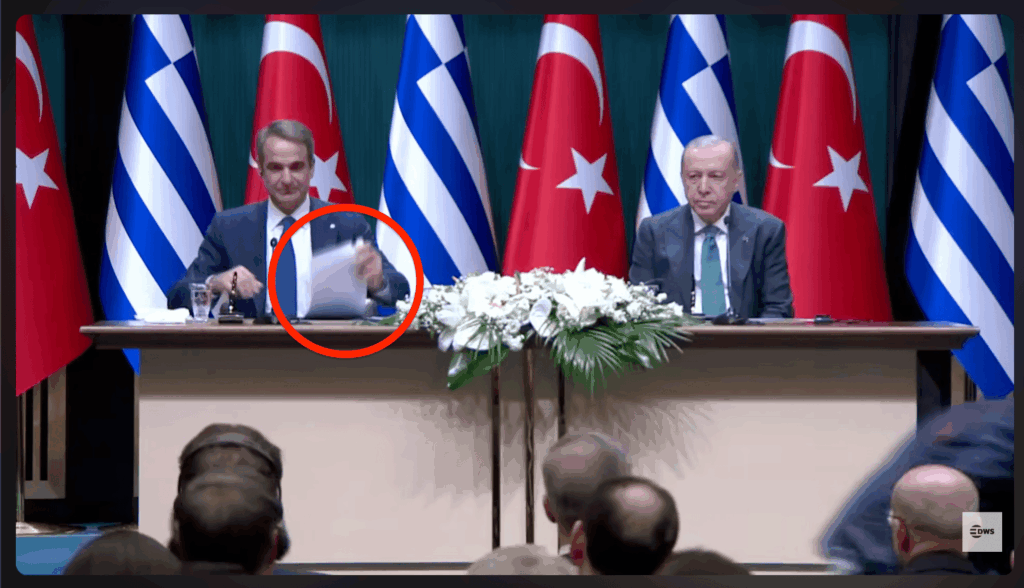 Μετά την ομιλία του Ρετζέπ Ταγίπ Ερντογάν, ο Κυριάκος Μητσοτάκης παίρνει τον λόγο από το 13:37 έως το 24:50, διάστημα κατά το οποίο χρησιμοποιεί τα έγγραφα που είχε βγάλει από τον φάκελο μπροστά του. Καθώς μιλά, γυρίζει τις σελίδες και στη συνέχεια τις τοποθετεί μία προς μία πάνω στον μπλε φάκελο.