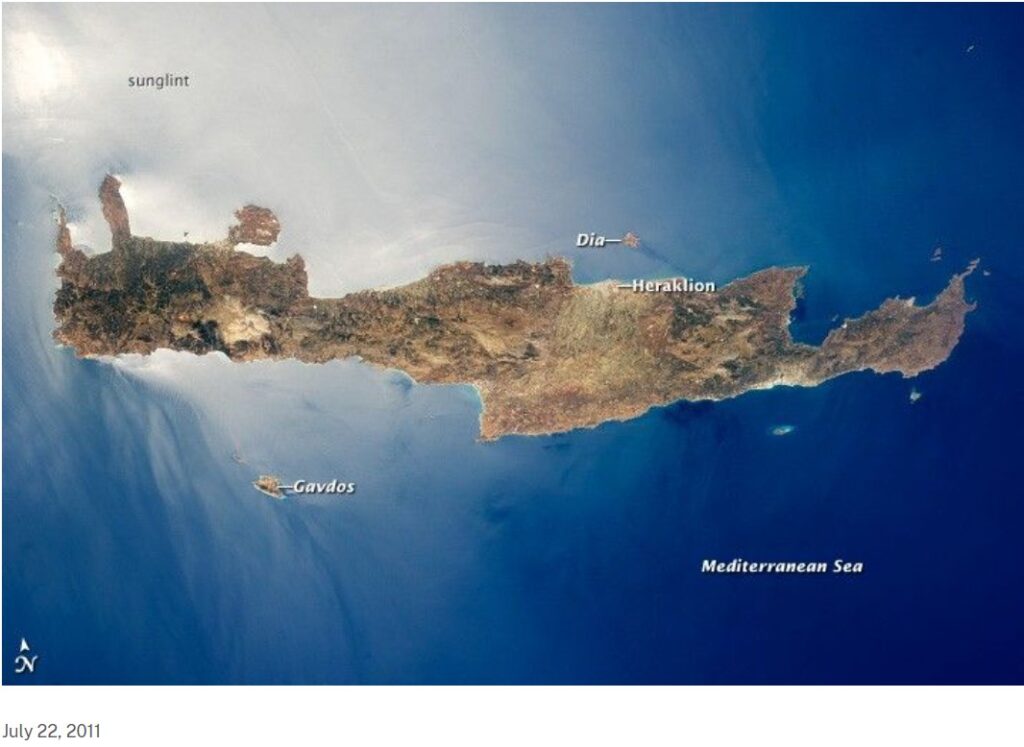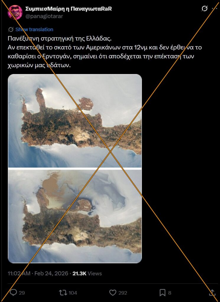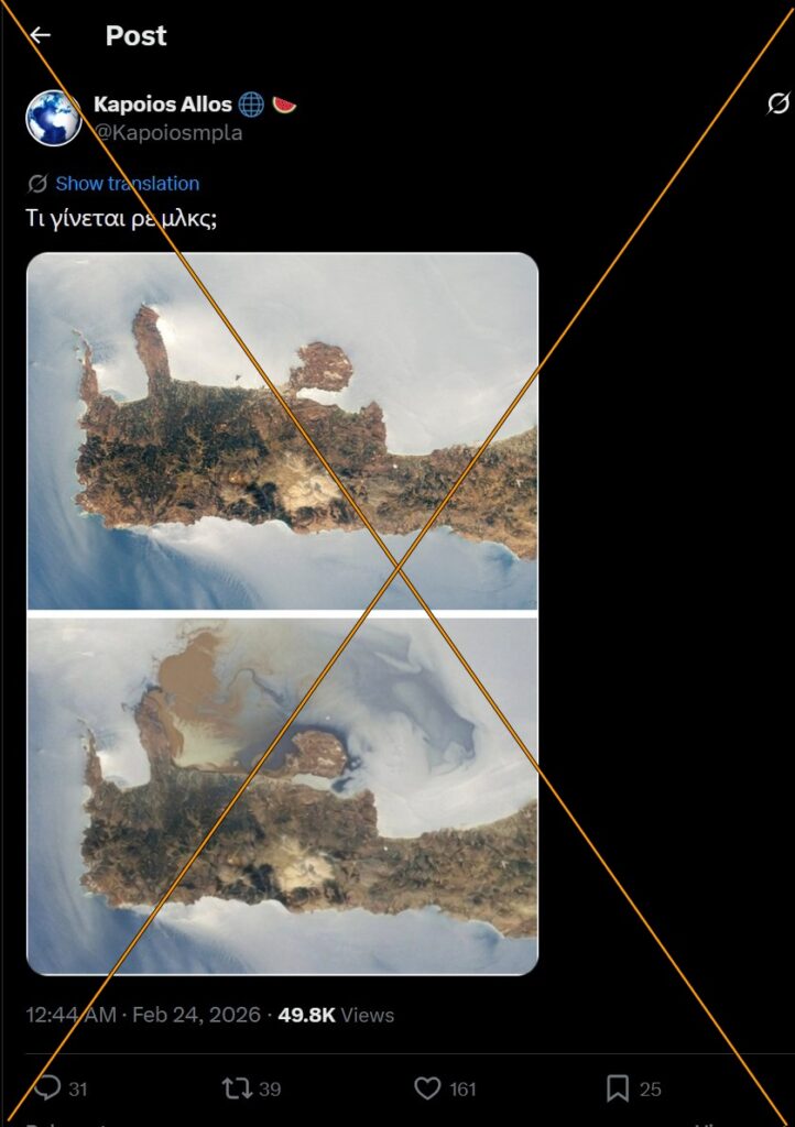 Την ίδια στιγμή, οι φωτογραφίες που κυκλοφόρησαν δεν είναι πρόσφατες. Προέρχονται από μια και μοναδική φωτογραφία της Κρήτης, που τραβήχτηκε το 2011, από το Διεθνή Διαστημικό Σταθμό (ISS). Η φωτογραφία του 2011, δέχτηκε επεξεργασία με την προσθήκη καφέ κηλίδας στη θάλασσα, για να μοιάζει με λύματα.