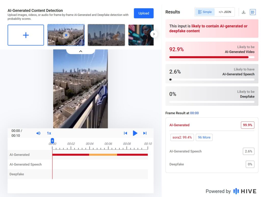 Αρχικά, αποθηκεύσαμε και έπειτα ανεβάσαμε το βίντεο στο εργαλείο HIVE για εξέταση. Σύμφωνα με το εργαλείο, οι πιθανότητες το βίντεο να είναι προϊόν AI, φτάνει στο 92,9%.