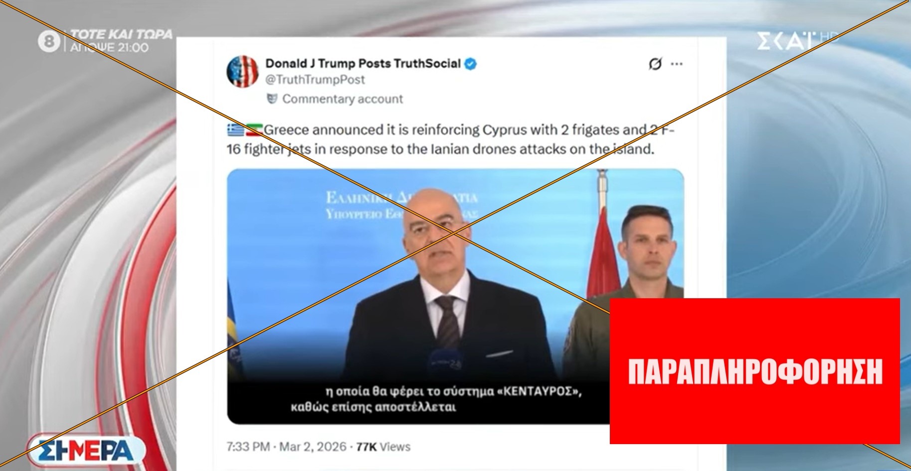 Μεγάλη διάδοση έχει ένα βίντεο που προέρχεται από την εκπομπή “Σήμερα” του ΣΚΑΪ, που φέρεται να δείχνει μια ανάρτηση του Αμερικανού προέδρου στο μέσο κοινωνικής δικτύωσης, Truth Social. Το βίντεο αναπαράχθηκε σε ελληνόφωνους λογαριασμούς, όπως στο X/Twitter και σε ιστοσελίδα που σχολιάζει πως στην υποτιθέμενη ανάρτηση του Αμερικανού προέδρου, εμφανίζεται μόνο ο υπουργός Εθνικής Άμυνας και όχι ο πρωθυπουργός Κυριάκος Μητσοτάκης.