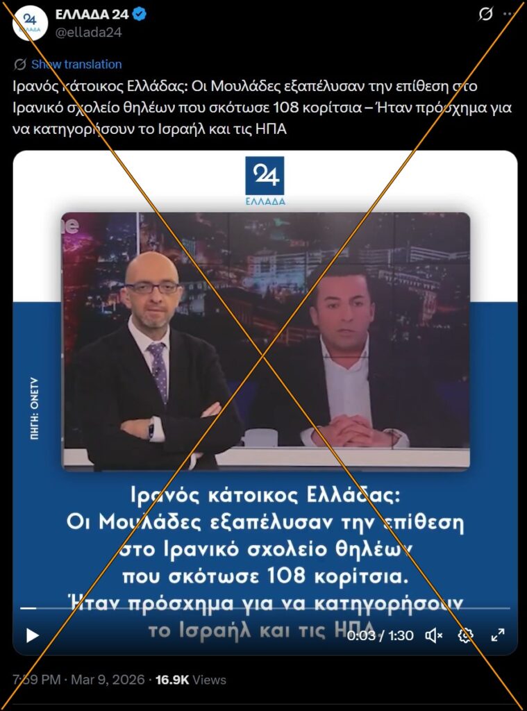 ΙΣΧΥΡΙΣΜΟΣ: Ιρανός κάτοικος Ελλάδας: Οι Μουλάδες εξαπέλυσαν την επίθεση στο Ιρανικό σχολείο θηλέων που σκότωσε 108 κορίτσια – Ήταν πρόσχημα για να κατηγορήσουν το Ισραήλ και τις ΗΠΑ.