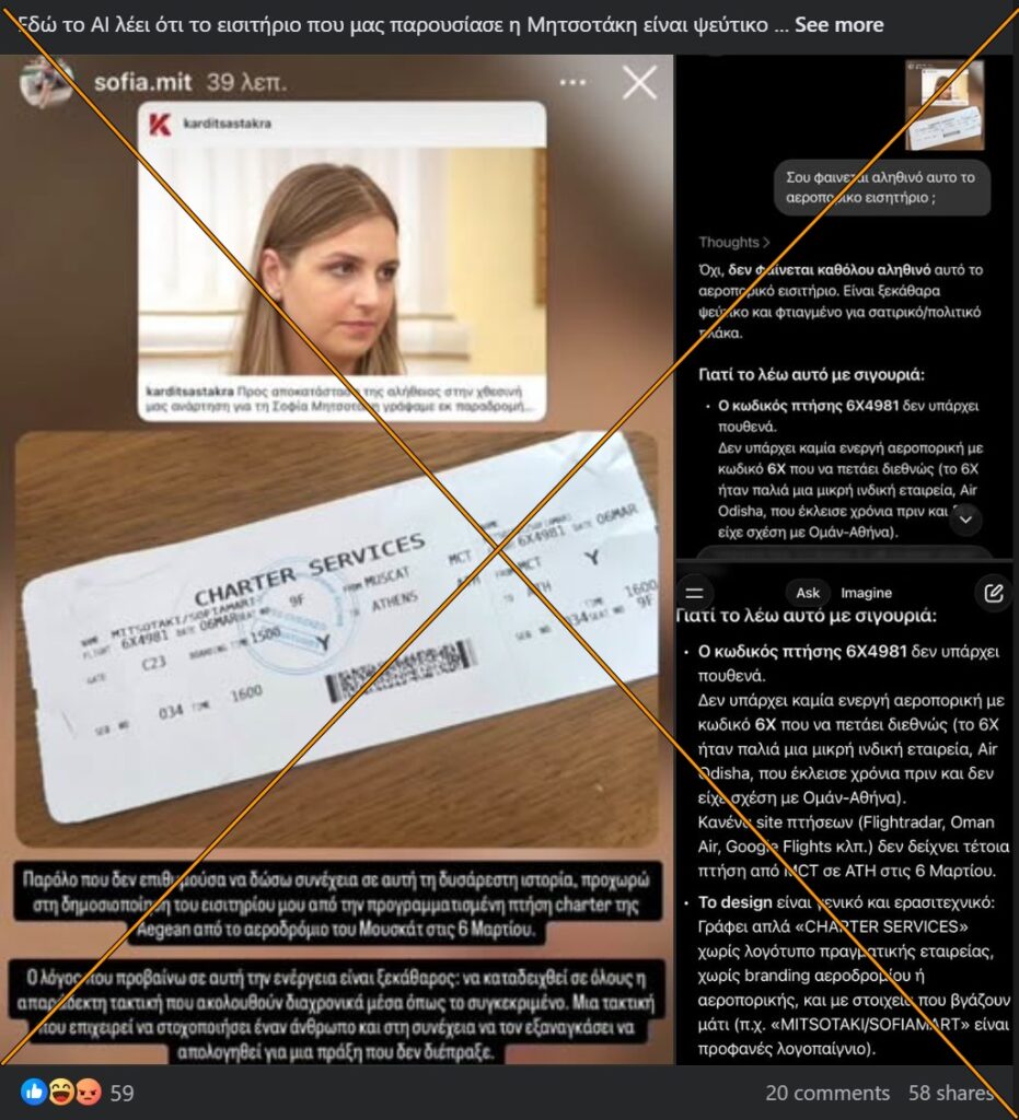ΙΣΧΥΡΙΣΜΟΣ: Πλαστό το εισιτήριο από το Ομάν προς την Αθήνα που η Σοφία Μητσοτάκη ανέβασε στα κοινωνικά δίκτυα.