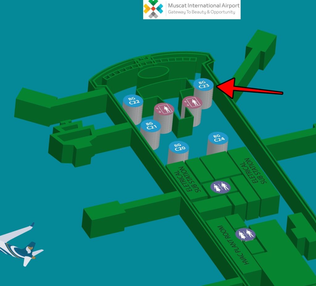 Υποστηρίχθηκε επίσης πως με βάση το boarding pass “Το αεροδρόμιο του Muscat έχει θύρες Α1-Α23, Β1-Β10, C1-C12. ΔΕΝ ΕΧΕΙ C23“. Το αεροδρόμιο λειτουργεί κυρίως από τον νέο τερματικό σταθμό που άνοιξε το 2018 και οι 45 συνολικά πύλες επιβίβασης χωρίζονται με τα γράμματα A, B και C, ανάλογα την πτέρυγα. Στην παρακάτω εικόνα από βίντεο, μπορούμε να δούμε πως η C23 είναι υπαρκτή.