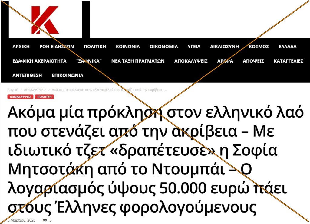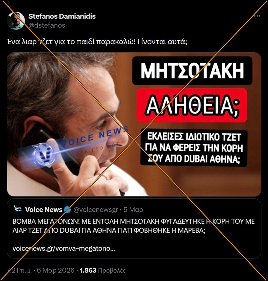 Η Σοφία Μητσοτάκη, η οποία ζει και εργάζεται μόνιμα στο Ντουμπάι, βρέθηκε στο επίκεντρο μιας έντονης αντιπαράθεσης, κυρίως στα μέσα κοινωνική δικτύωσης. Λόγω της κλιμάκωσης των πολεμικών συγκρούσεων στην περιοχή, η Ελλάδα οργάνωσε επιχειρήσεις επαναπατρισμού. Κατόπιν, κυκλοφόρησε στις 6 Μαρτίου 2026, ένα δημοσίευμα στην ιστοσελίδα Karditsa Sta Akra που υποστήριζε ότι η κόρη του πρωθυπουργού “δραπέτευσε” από το Ντουμπάι με ιδιωτικό τζετ, με κόστος 50.000 ευρώ που επιβάρυνε το δημόσιο. Είχε προηγηθεί στις 5/3, δημοσίευμα στο voicenews.gr (έχει κατέβει), που συχνά απηχεί τις θέσεις του Κυριάκου Βελόπουλου. Σε αυτό, αναφέρεται πως ο πρωθυπουργός Κυριάκος Μητσοτάκης, απαιτούσε από τους υπεύθυνους που συντόνιζαν την επιστροφή Ελλήνων πολιτών, την επιστροφή της κόρης του, ακόμη και με ιδιωτικό τζετ που θα κόστιζε 50 χιλιάδες ευρώ.