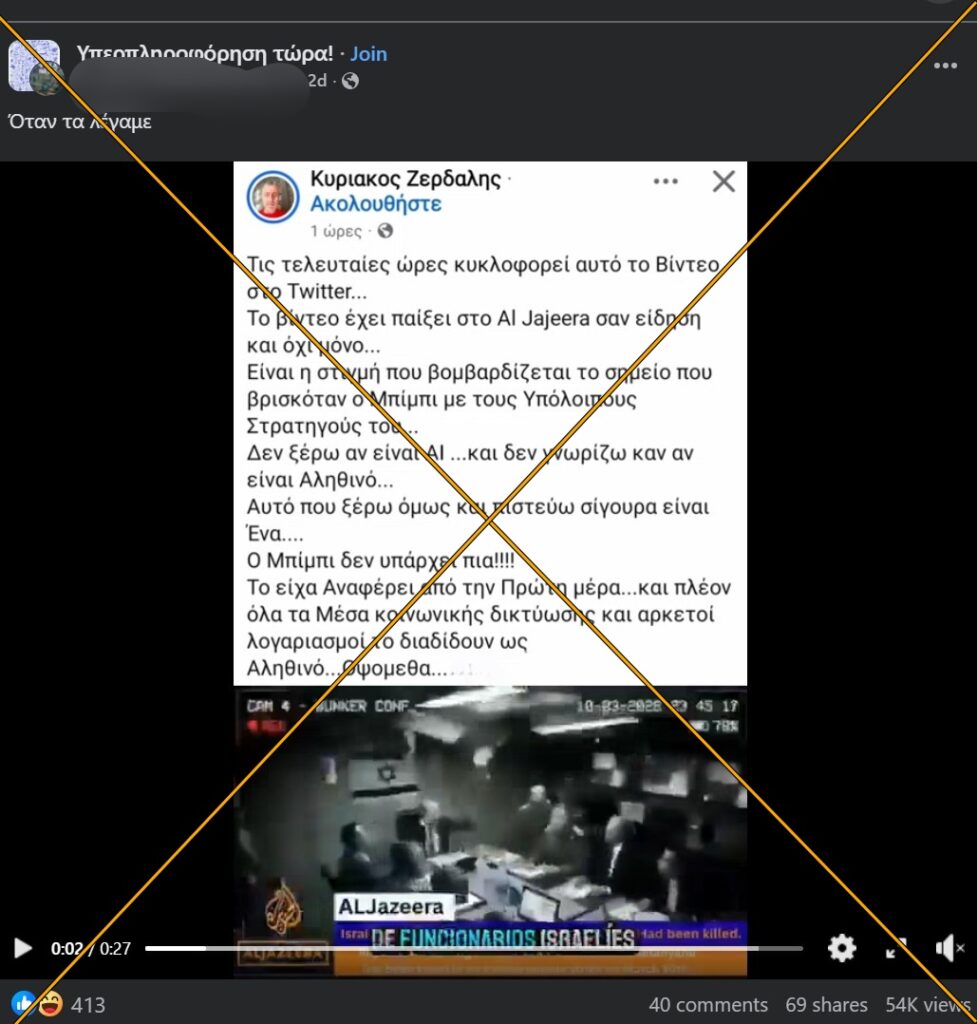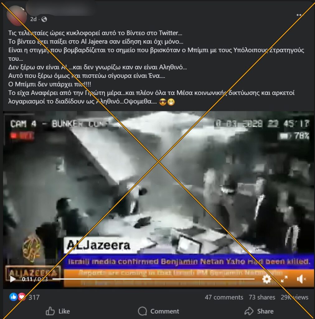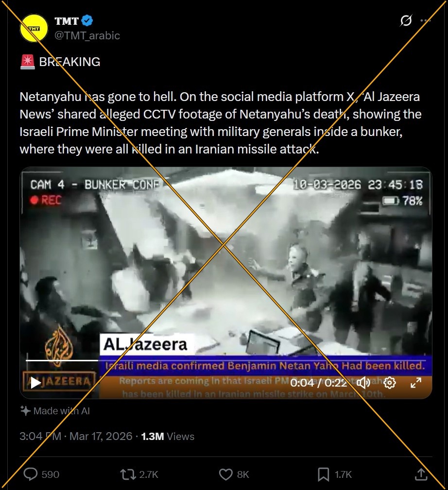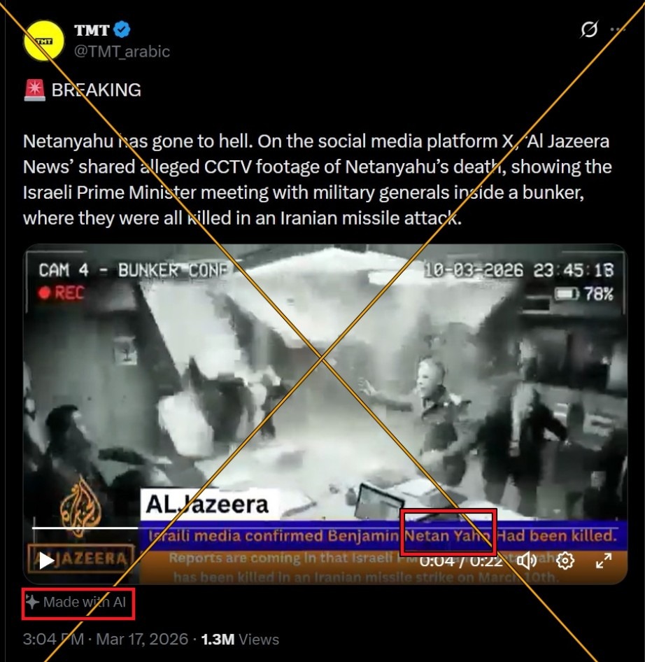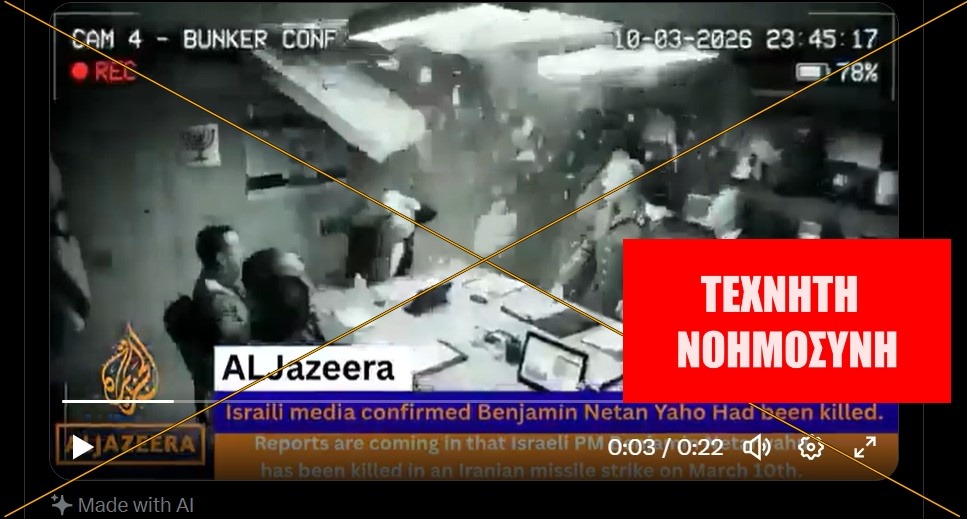 Πάνω από 80 χιλιάδες θεάσεις έχει ένα βίντεο που εμφανίστηκε σε δυο αναρτήσεις στο Facebook και δείχνει τον πρωθυπουργό του Ισραήλ, Μπένιαμιν Νετανιάχου να καταπλακώνεται από συντρίμια, έπειτα από ιρανική πυραυλική επίθεση στο καταφύγιό του. Ο ίδιος ισχυρισμός συγκέντρωσε πολλά εκατομμύρια προβολές, μέσω φιλοϊρανικών λογαριασμών στο X, από τις 17/3/2026 και έπειτα.