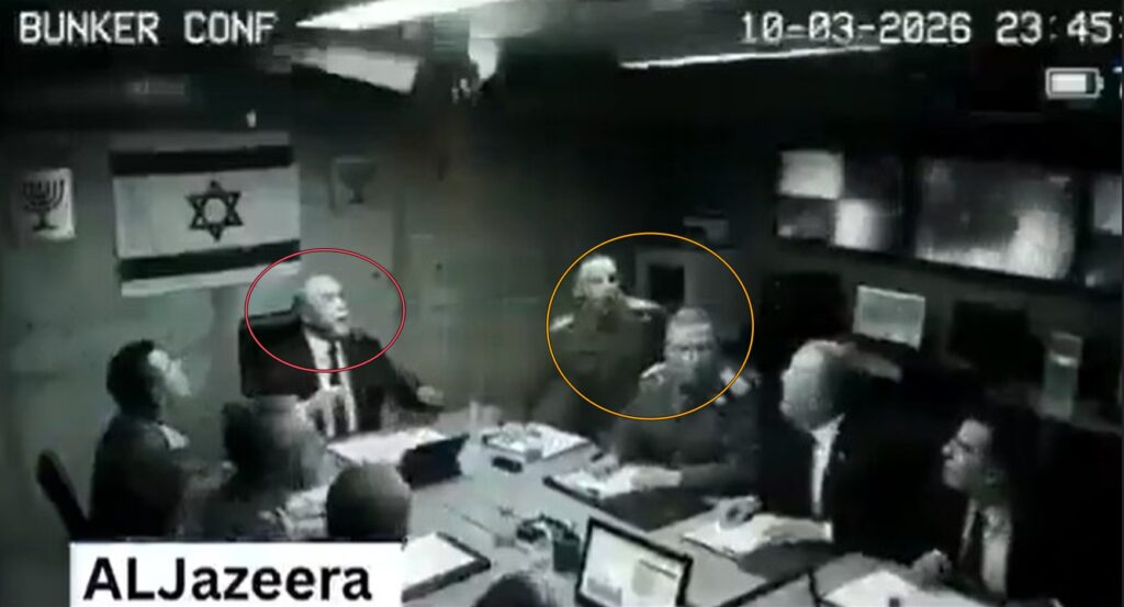 Επιπλέον, εξετάζοντας προσεκτικά το βίντεο, διαπιστώνουμε πως το πρόσωπο στον κόκκινο κύκλο δεν μοιάζει με τον Νετανιάχου, ενώ τα πρόσωπα των “στρατηγών” είναι παραμορφωμένα και δισδιάκριτα.