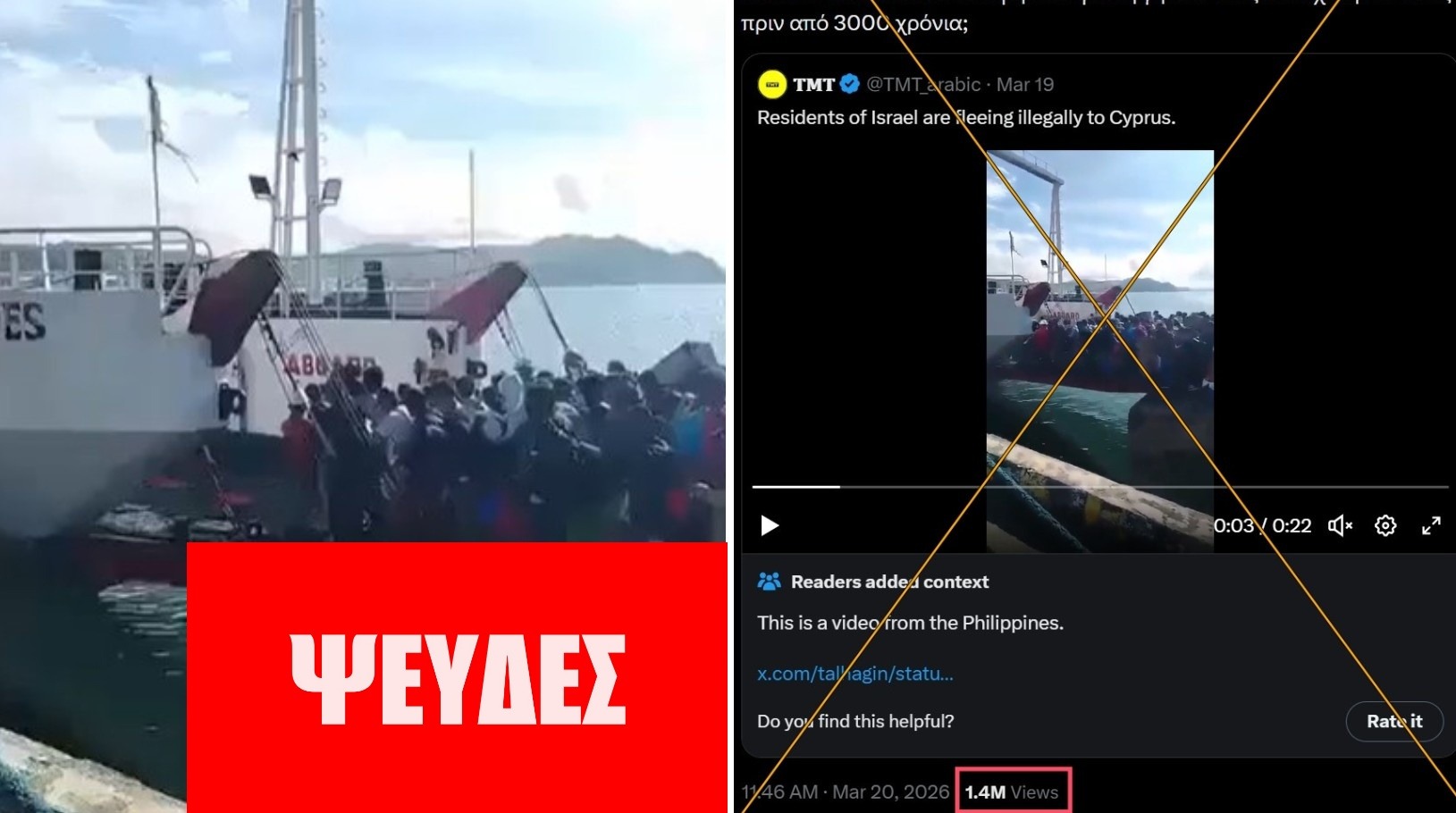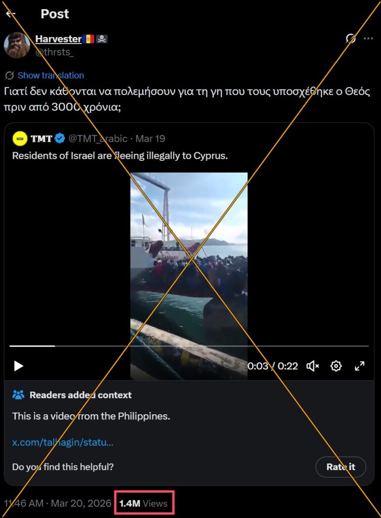 Το υπό έλεγχο βίντεο, που αναδημοσιεύτηκε και από τη δημοσιογράφο Μαρία Δεναξά, προέρχεται από το λογαριασμό @TMT_arabic και συγκέντρωσε πάνω από 1,8 εκατομμύρια προβολές. Πρόκειται για έναν λογαριασμό που δημιουργήθηκε στις αρχές Μαρτίου, το περιεχόμενου του οποίου έχουμε εξετάσει ξανά στο πρόσφατο παρελθόν. Αναπαράχθηκε επίσης από τον ελληνόφωνο λογαριασμό @thrsts_. Αυτό το ποστ έχει συγκεντρώσει περίπου 1.415.000 προβολές, 29.419 likes, 2.436 reposts, 43 quotes, 237 απαντήσεις και 976 bookmarks, παρά το γεγονός πως η κοινότητα των Community Notes, επισήμανε πως το βίντεο είναι από τις Φιλιππίνες.