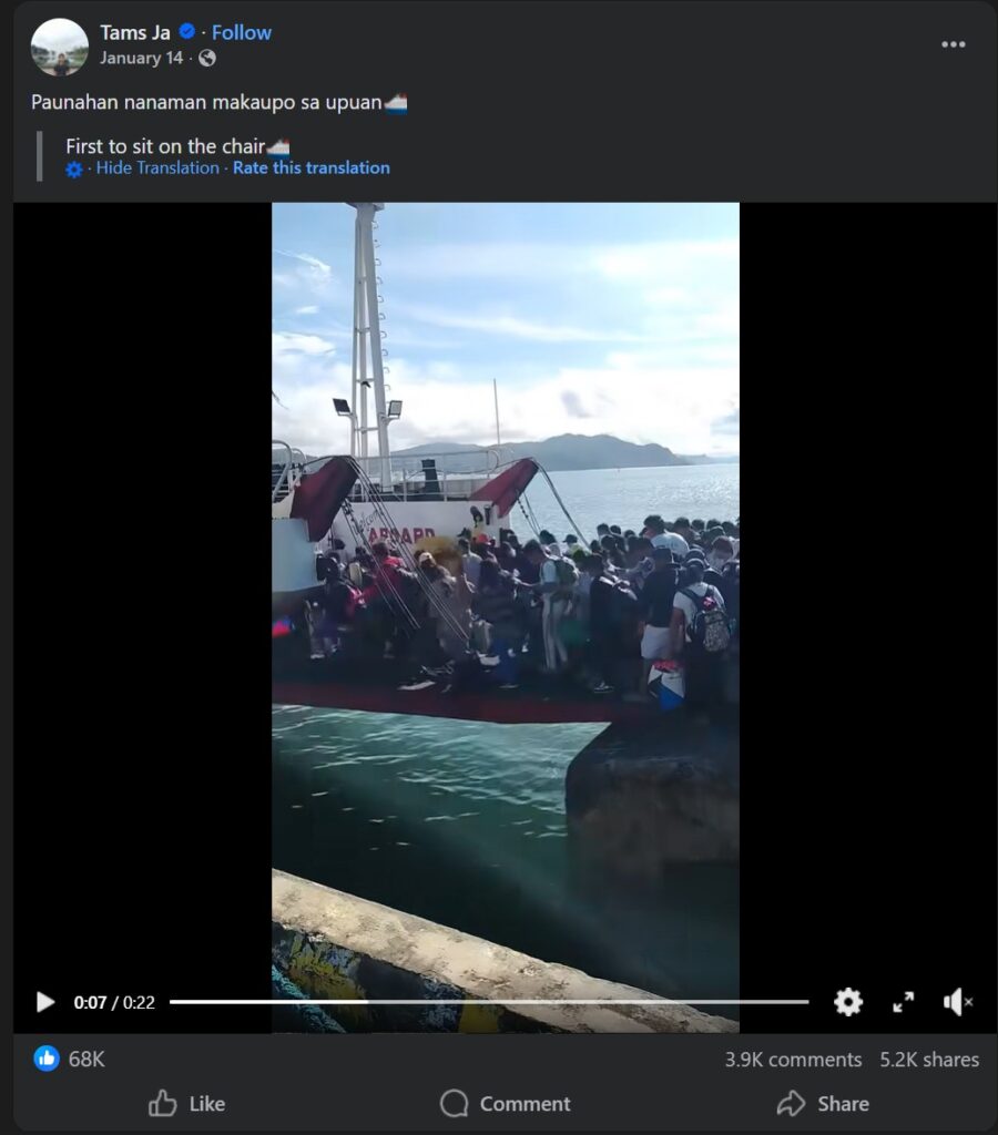 Η φράση στο βίντεο με ημερομηνία 14/1/2026, είναι στα ταγκαλόγκ (φιλιππινέζικα) και σημαίνει: “Πάλι βιάζονται να προλάβουν να κάτσουν στην καρέκλα” ή σε πιο φυσική απόδοση στα ελληνικά: “Πάλι τρέχουν να προλάβουν ποιος θα καθίσει στην καρέκλα“. Το βίντεο καυτηριάζει τους ναυτιλιακούς φορείς στις Φιλιππίνες, οι οποίοι, σύμφωνα με τοπικά δημοσιεύματα, ζητούν από τις αρχές να χαλαρώσουν τους κανονισμούς για τα πληρώματα, γιατί υπάρχει έλλειψη καταρτισμένων ναυτικών και αυτό αρχίζει να δημιουργεί προβλήματα στις τοπικές θαλάσσιες μεταφορές.