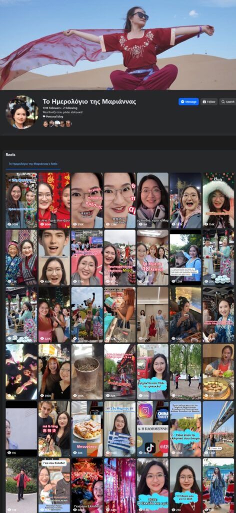 Finally, it is a documented practice that the Chinese Communist Party uses influencers to feature Western citizens (e.g. bloggers, vloggers, students, academics) visiting China, often unknowingly, to promote exclusively positive images of the country. Similarly, Greek individuals have appeared in the accounts examined here. For example, a video featuring Greek students from Aristotle University and the University of Athens reached over 3.5 million views in Greece and Cyprus via the “Sweet Hope” account, partly due to paid promotion on Facebook.