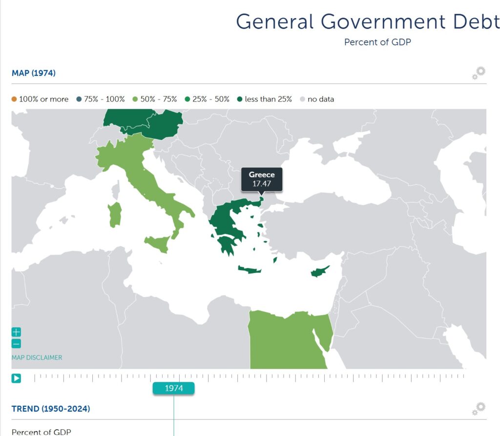 Τα ιστορικά δεδομένα του Διεθνούς Νομισματικού Ταμείου δείχνουν ότι το γενικό χρέος της κυβέρνησης το 1974 ήταν περίπου στο 17,47% του ΑΕΠ, γεγονός που αποκλείει οποιοδήποτε ενδεχόμενο μηδενικού χρέους. Τα στοιχεία αυτά μπορούν να επιβεβαιωθούν στη βάση δεδομένων του IMF για το δημόσιο χρέος.