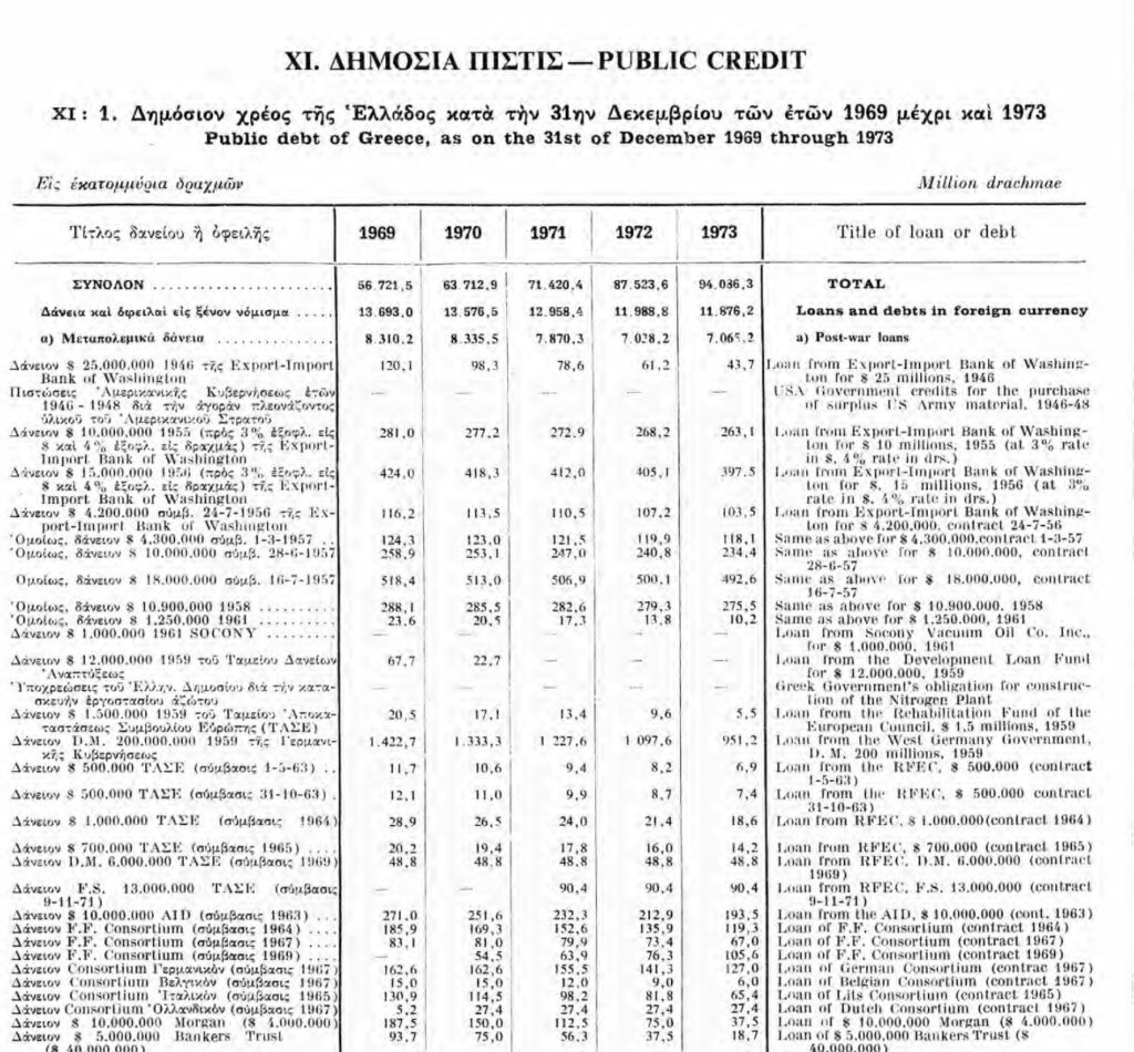 Σύμφωνα με την έκδοση της Εθνικής Στατιστικής Υπηρεσίας της Ελλάδος “Στατιστική Δημοσίων Οικονομικών 1974” (η οποία εκδόθηκε το 1975 και περιλαμβάνει στοιχεία έως και το οικονομικό έτος 1973), προκύπτει με σαφήνεια ότι η Ελλάδα είχε ήδη σημαντικό και αυξανόμενο δημόσιο χρέος, το οποίο περιλάμβανε και εξωτερικό δανεισμό. Συγκεκριμένα, το δημόσιο χρέος της χώρας αναφέρεται ότι ανήλθε περίπου σε 94 δισ. δραχμές το 1972 και αυξήθηκε σε περίπου 101 δισ. δραχμές το 1973, δείχνοντας καθαρή ανοδική τάση. Παράλληλα, η έκθεση διευκρινίζει ότι αυτό το χρέος αποτελείται από εσωτερικό και εξωτερικό, ενώ καταγράφεται και ενεργός δανεισμός τόσο από το εσωτερικό όσο και από το εξωτερικό για τη χρηματοδότηση δαπανών και ελλειμμάτων. Επιπλέον, γίνεται αναφορά σε δανειακές ροές, ξένη χρηματοδότηση και υποχρεώσεις προς εξωτερικούς φορείς, κάτι που επιβεβαιώνει ότι η χώρα είχε ήδη ενσωματωμένο εξωτερικό χρέος στη δομή των δημοσίων οικονομικών της. Συνολικά, τα ίδια τα επίσημα στοιχεία της εποχής αποδεικνύουν ότι όχι μόνο δεν υπήρχε “μηδενικό χρέος”, αλλά υπήρχε σημαντικό και αυξανόμενο δημόσιο (και εν μέρει εξωτερικό) χρέος πριν το 1974.